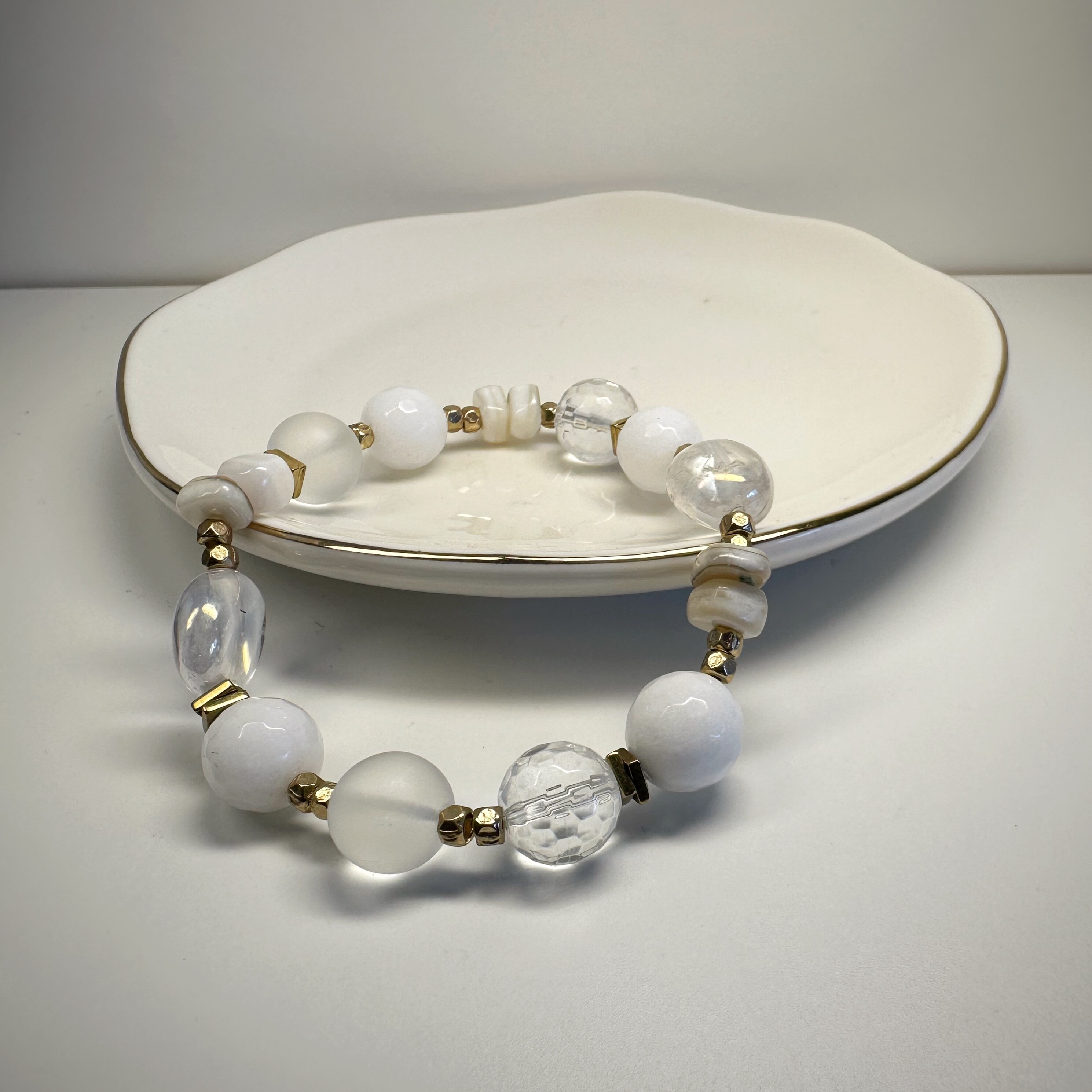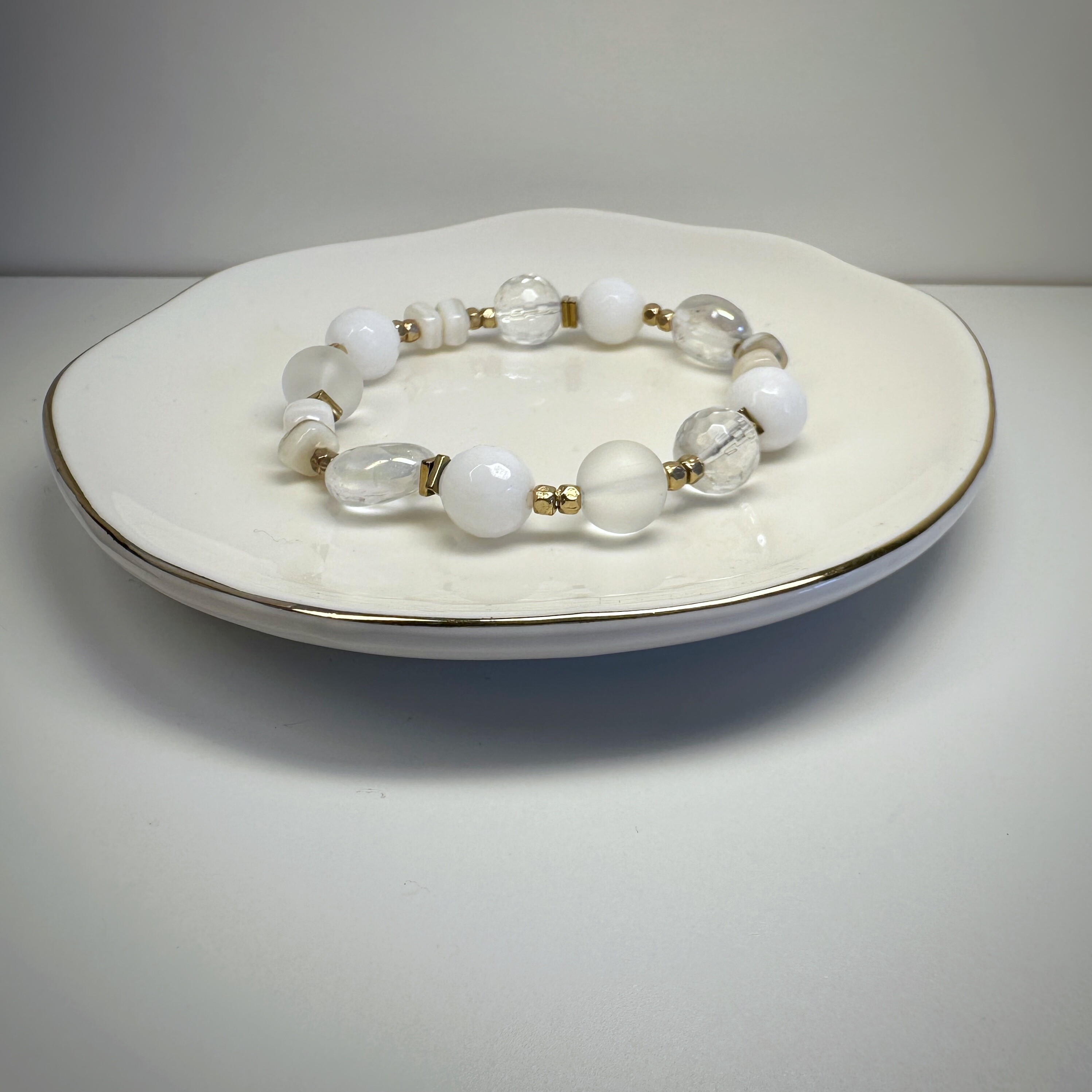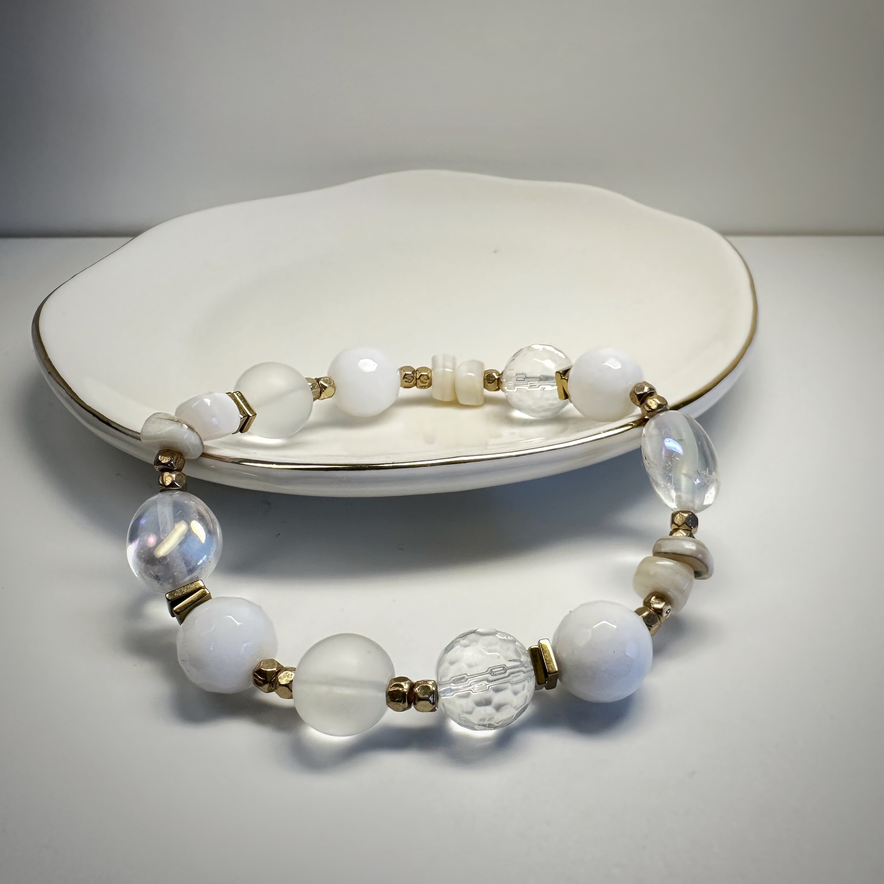 Zamknij oczy i wyobraź sobie świt – ten najczystszy, lekko zamglony, gdy świat budzi się bez hałasu. Właśnie taką aurę tworzy Spokojna Aura. Biały agat koi myśli, matowy mleczny kwarc oczyszcza przestrzeń serca, a złoty hematytsubtelnie uziemia, nie odbierając lekkości. Perłowy akcent – niczym dotyk intuicji – dodaje całości wyjątkowej delikatności.