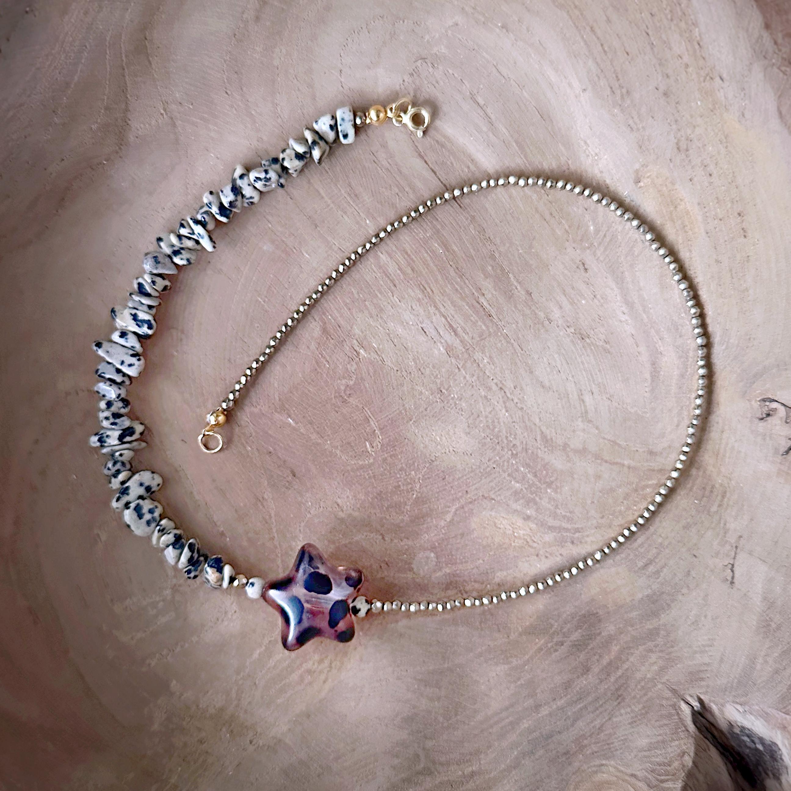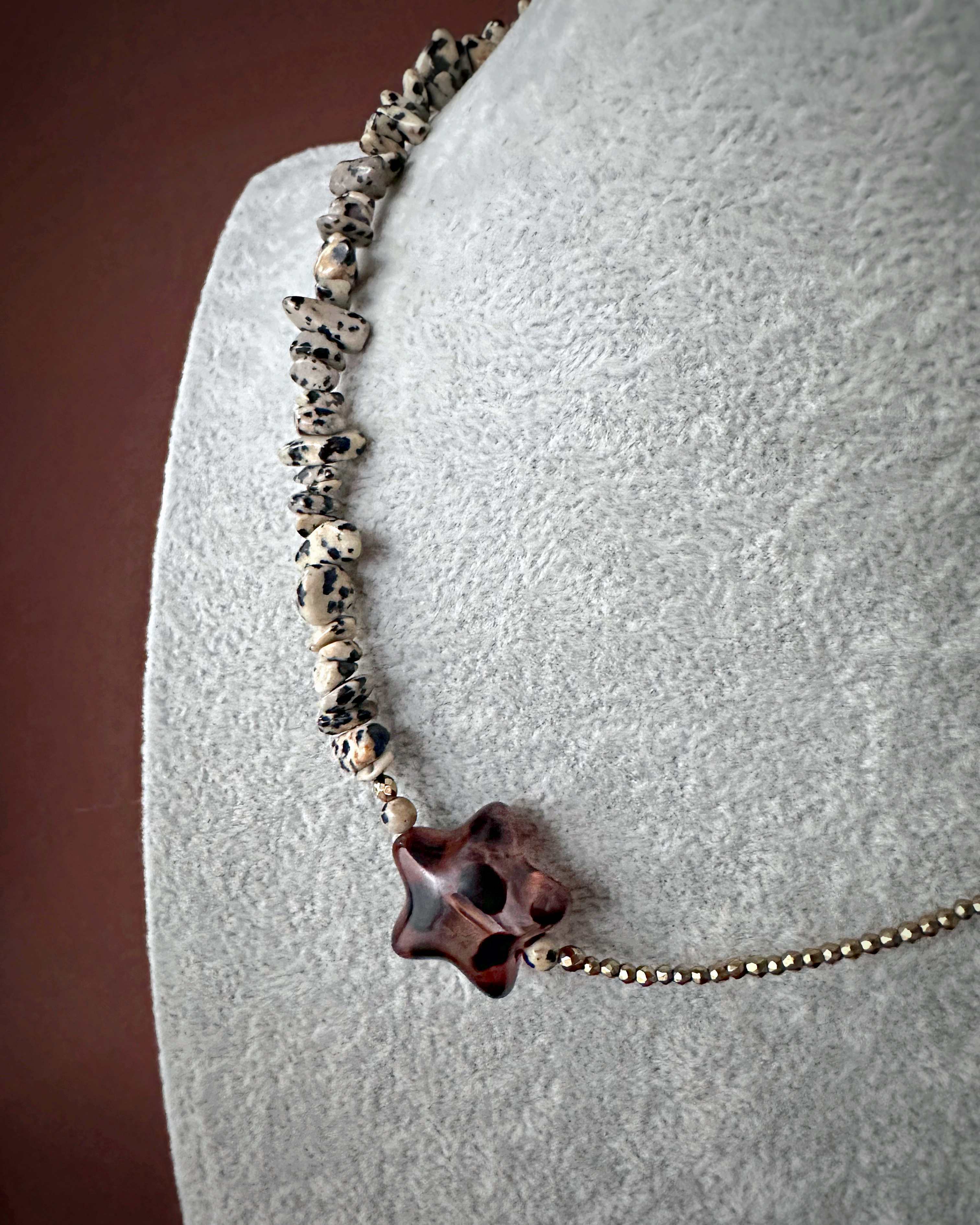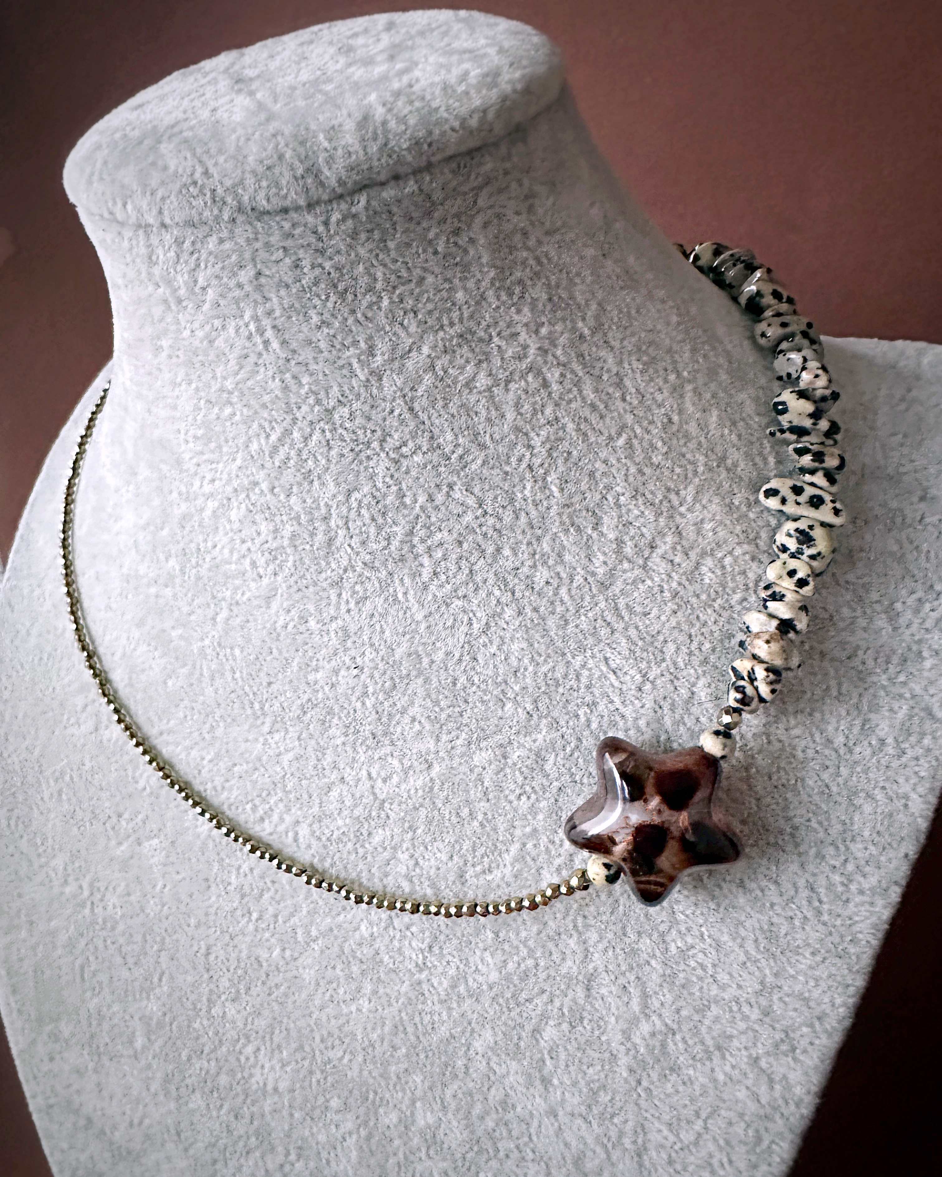 To biżuteria dla osób, które lubią balans pomiędzy ziemią a światłem. Naszyjnik z serii "pół na pół" gdzie dwa rodzaje kamieni łączy wyrazisty detal gwiazdy. Zawieszka po założeniu układa się asymetrycznie, co nadaje wyrazistego charakteru stylizacji. Jaspis dalmatyński wnosi energię spokoju i stabilności, hematyt dodaje odwagi i siły, a gwiazda symbol spełnionych marzeń przyciąga to, co dobre. Całość dopełnia zapięcie ze srebra pozłacanego, które nadaje naszyjnikowi szlachetności.
