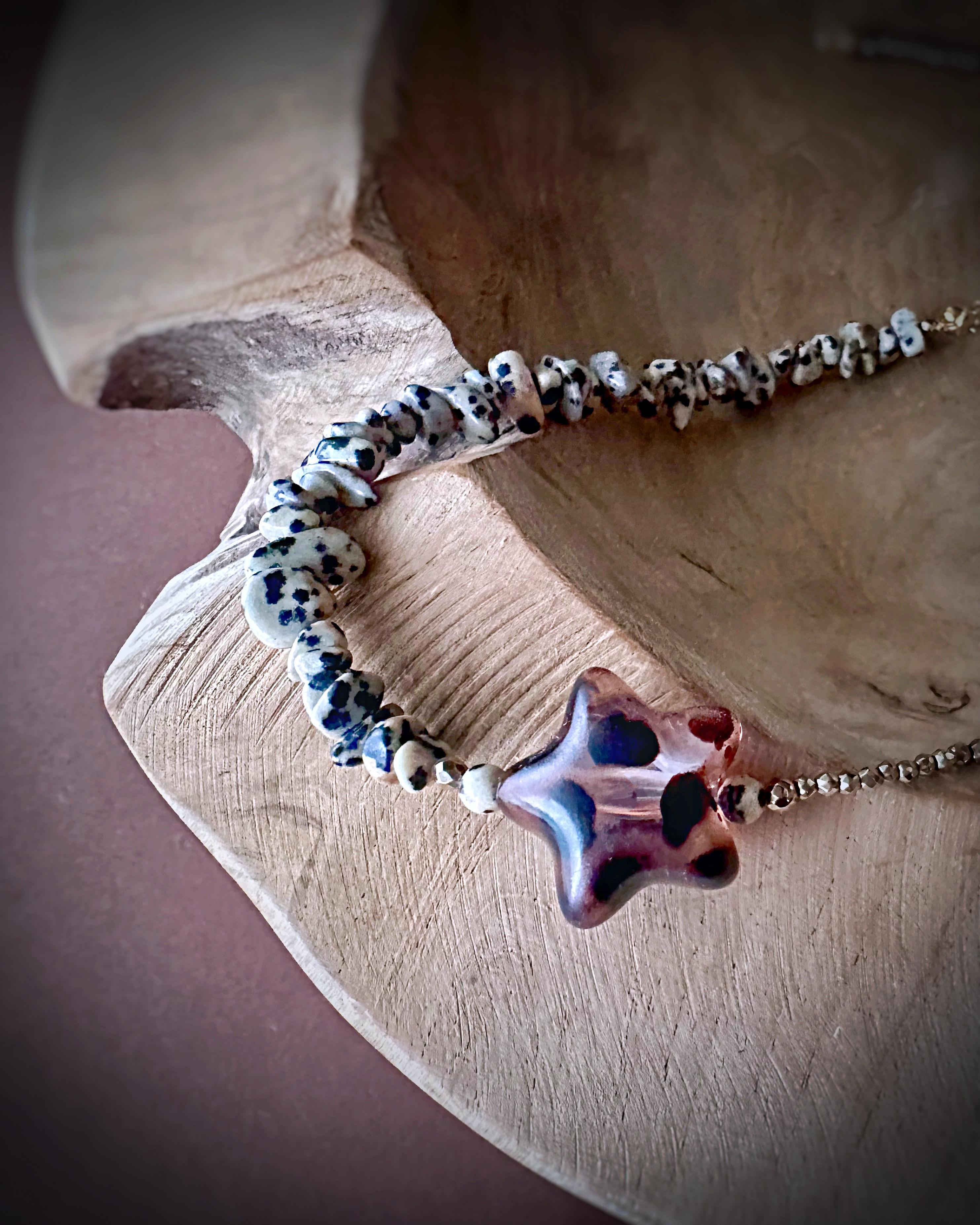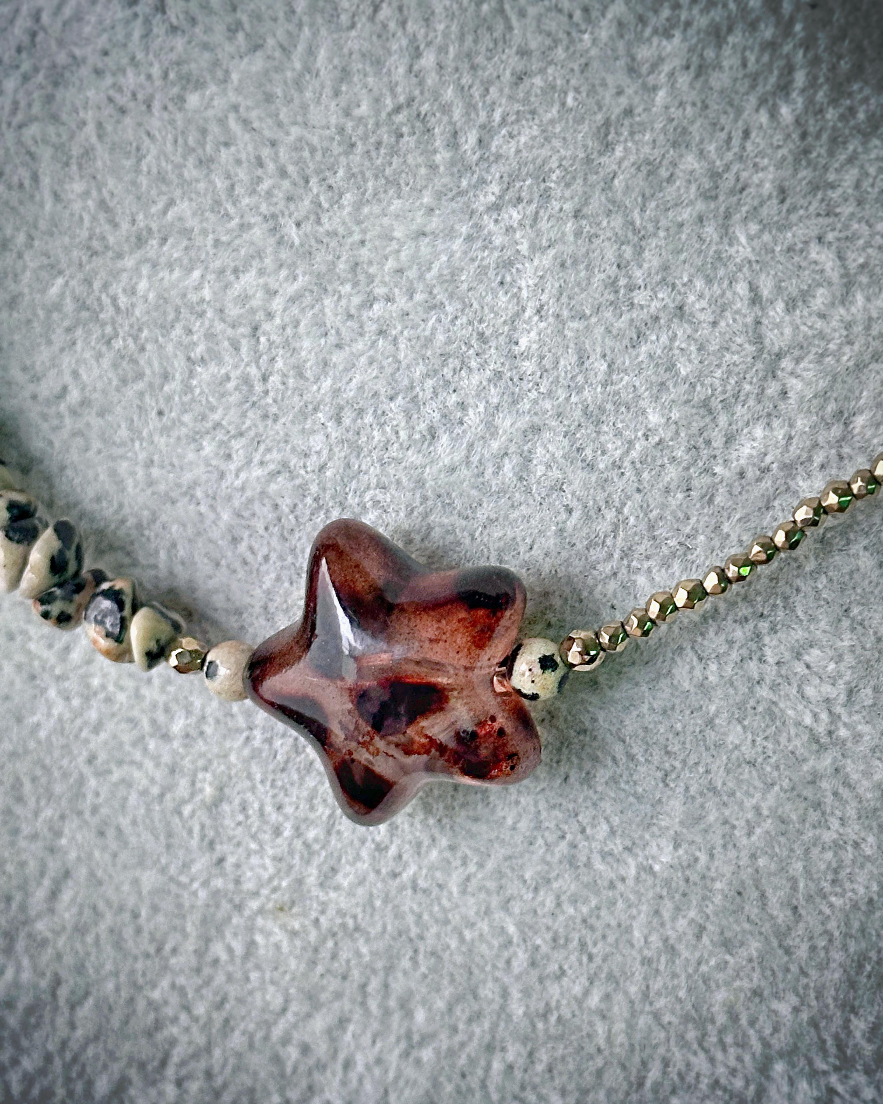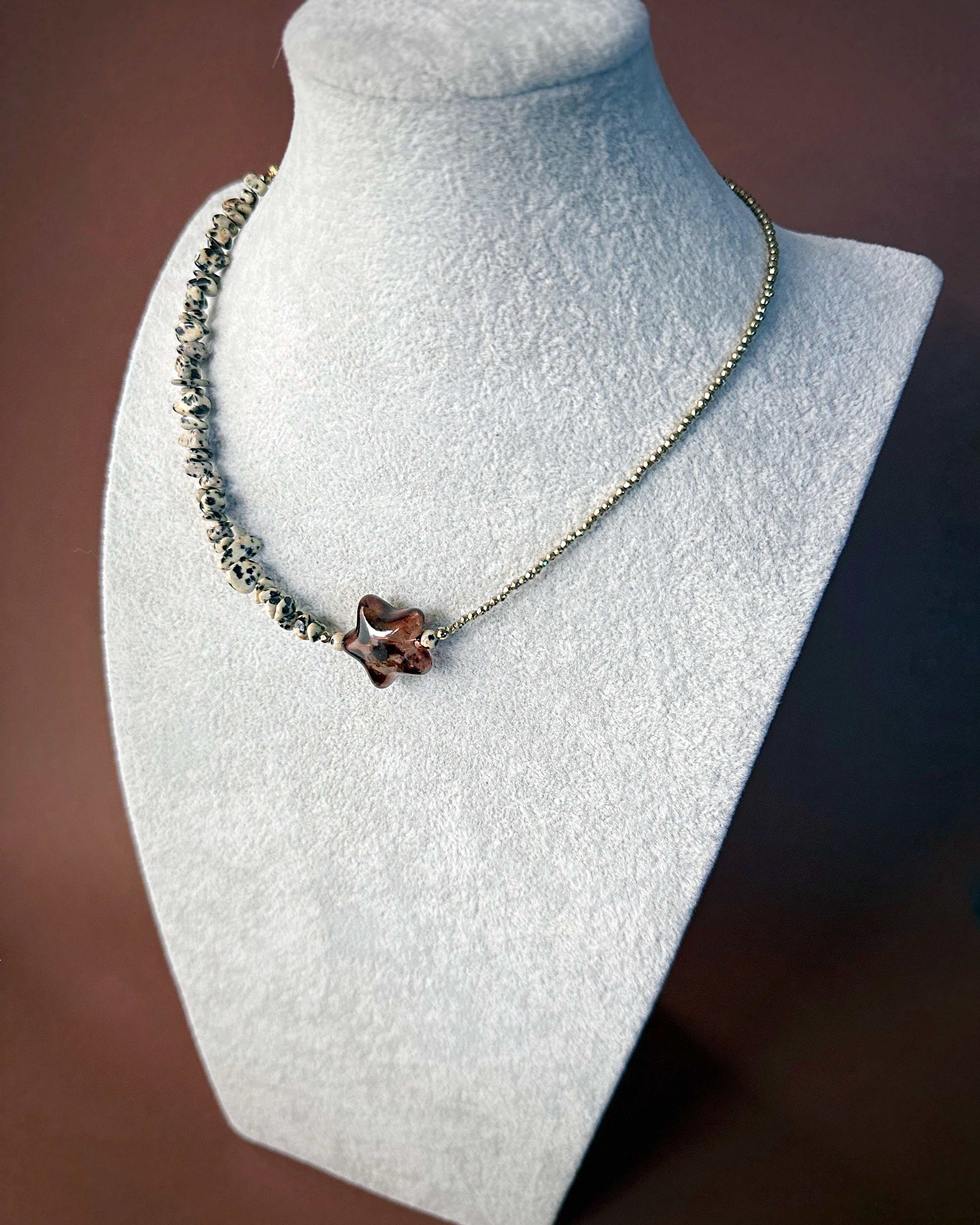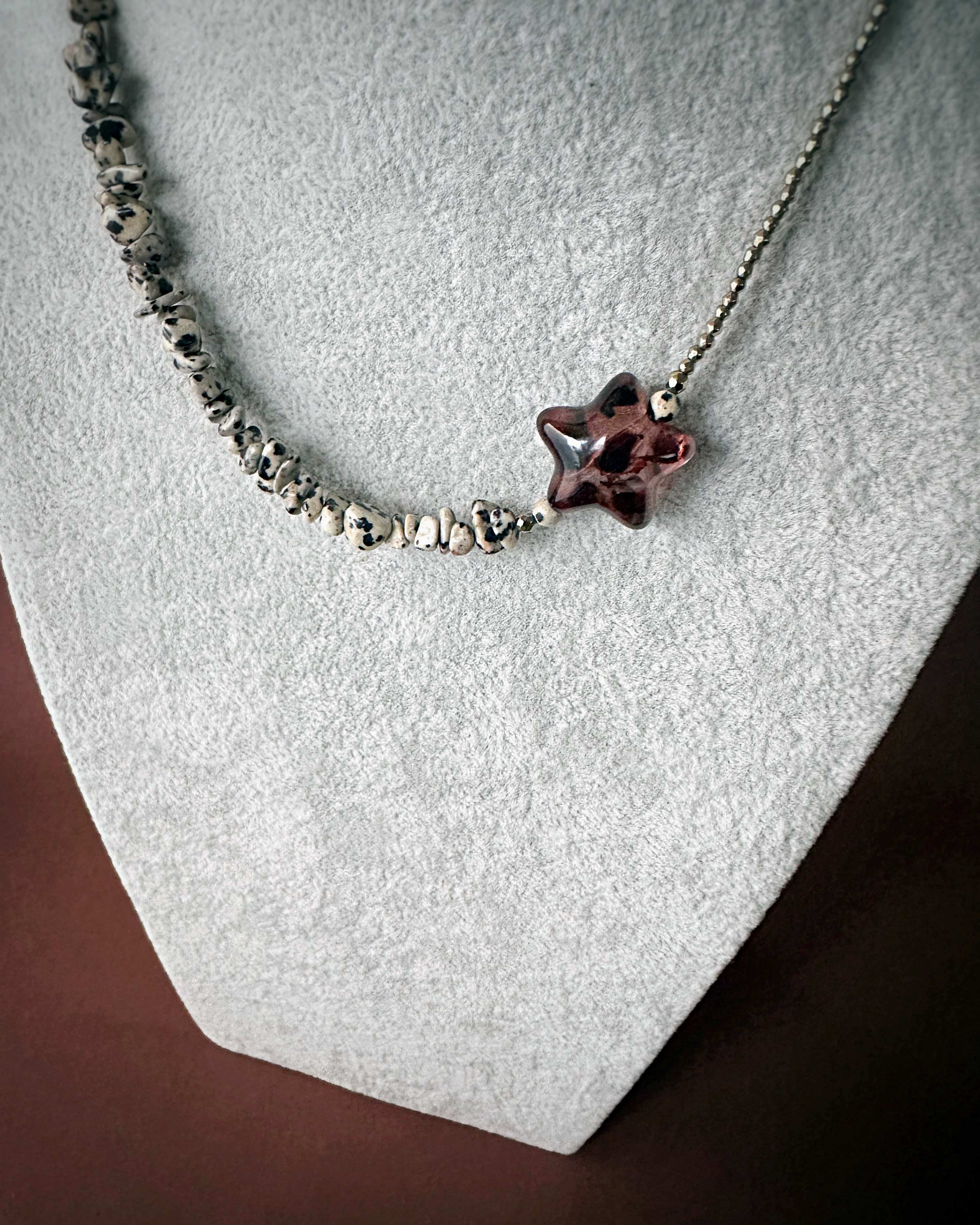 To biżuteria dla osób, które lubią balans pomiędzy ziemią a światłem. Naszyjnik z serii "pół na pół" gdzie dwa rodzaje kamieni łączy wyrazisty detal gwiazdy. Zawieszka po założeniu układa się asymetrycznie, co nadaje wyrazistego charakteru stylizacji. Jaspis dalmatyński wnosi energię spokoju i stabilności, hematyt dodaje odwagi i siły, a gwiazda symbol spełnionych marzeń przyciąga to, co dobre. Całość dopełnia zapięcie ze srebra pozłacanego, które nadaje naszyjnikowi szlachetności.