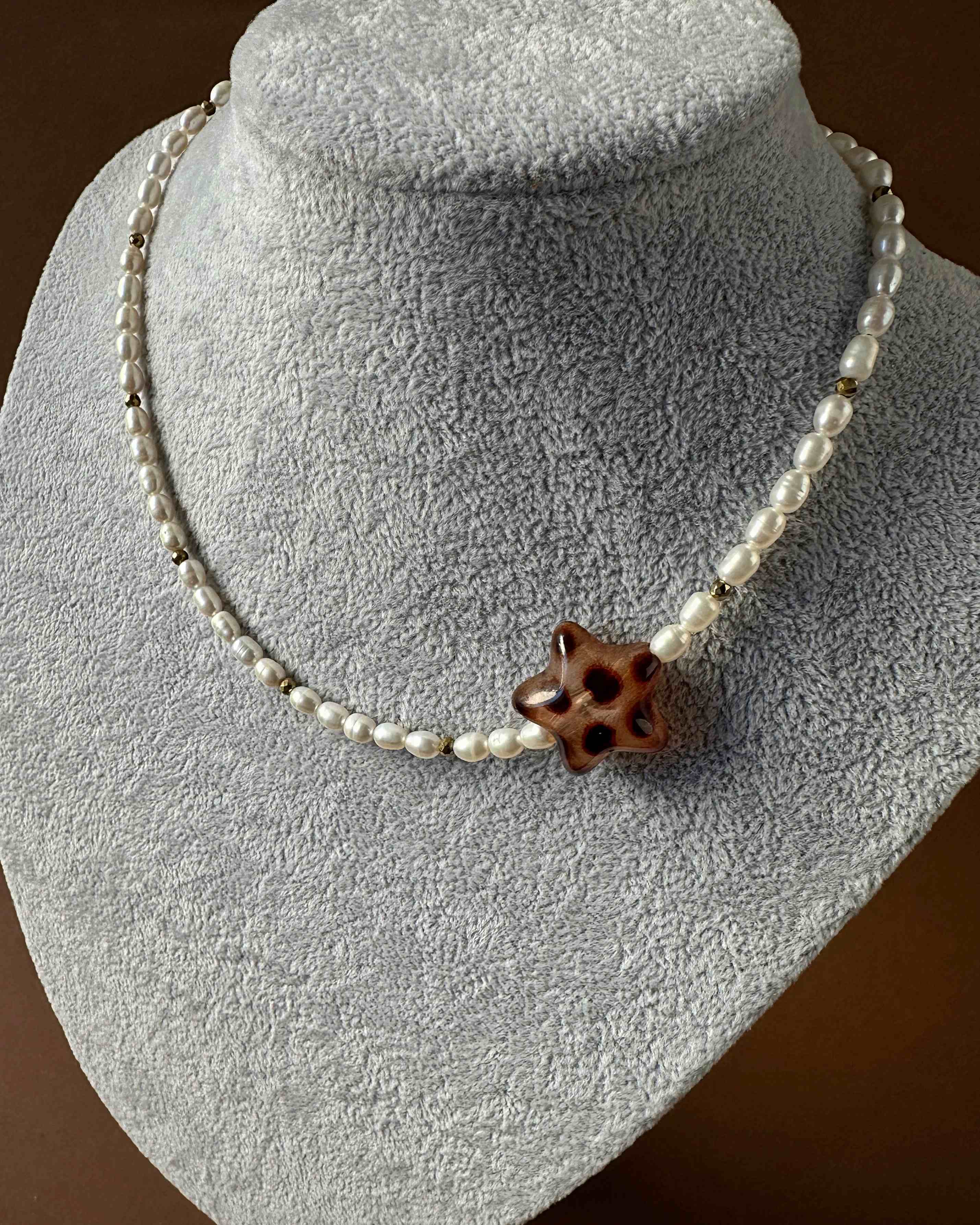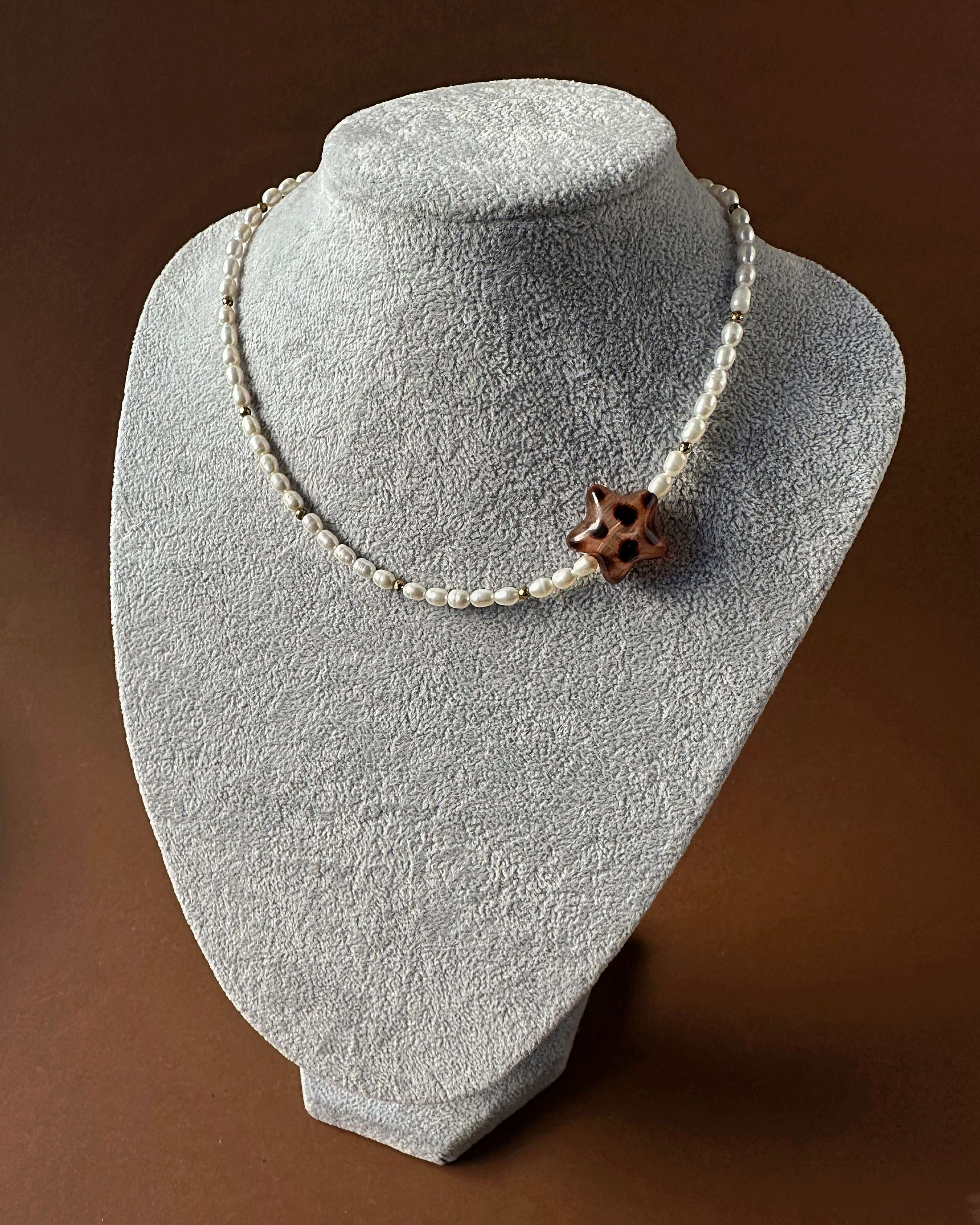 Połączenie klasyki i nowoczesności w kobiecej, subtelnej odsłonie. Perły symbolizują czystość i mądrość, a gwiazda dodaje odrobiny tajemniczości i odwagi do rozpoczęcia drogi w stronę marzeń. Drobne hematyty rozświetlają całość niczym mikroskopijne iskierki światła. Naszyjnik, który łączy miękkość i moc w jednym geście.