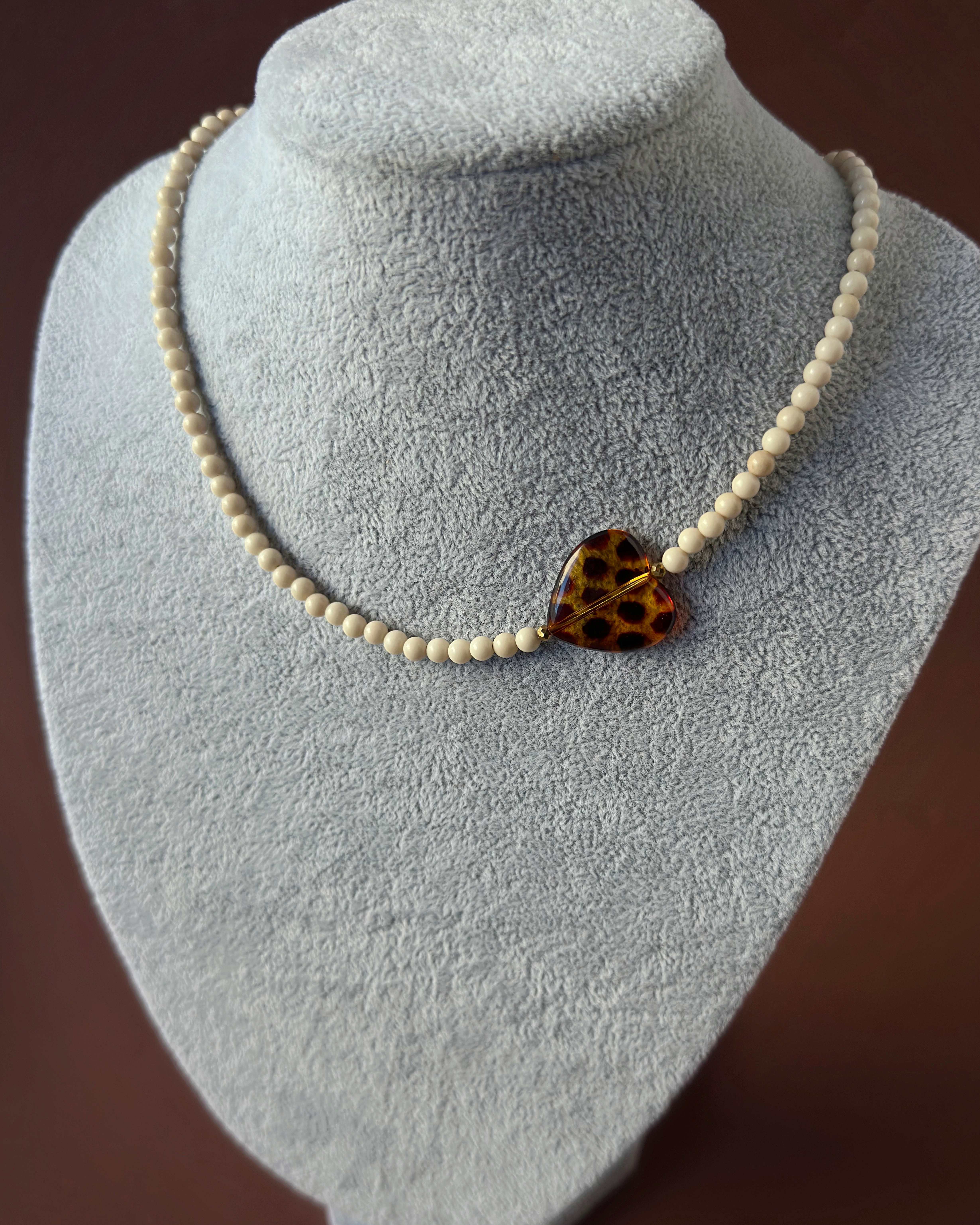 Naszyjnik świetnie komponuje się z naturalnymi materiałami, szczególnie z lnem, bawełną i dzianiną w odcieniach beżu, karmelu i bieli. Serce pięknie wybija się na tle prostych t-shirtów i koszul o surowej fakturze.
