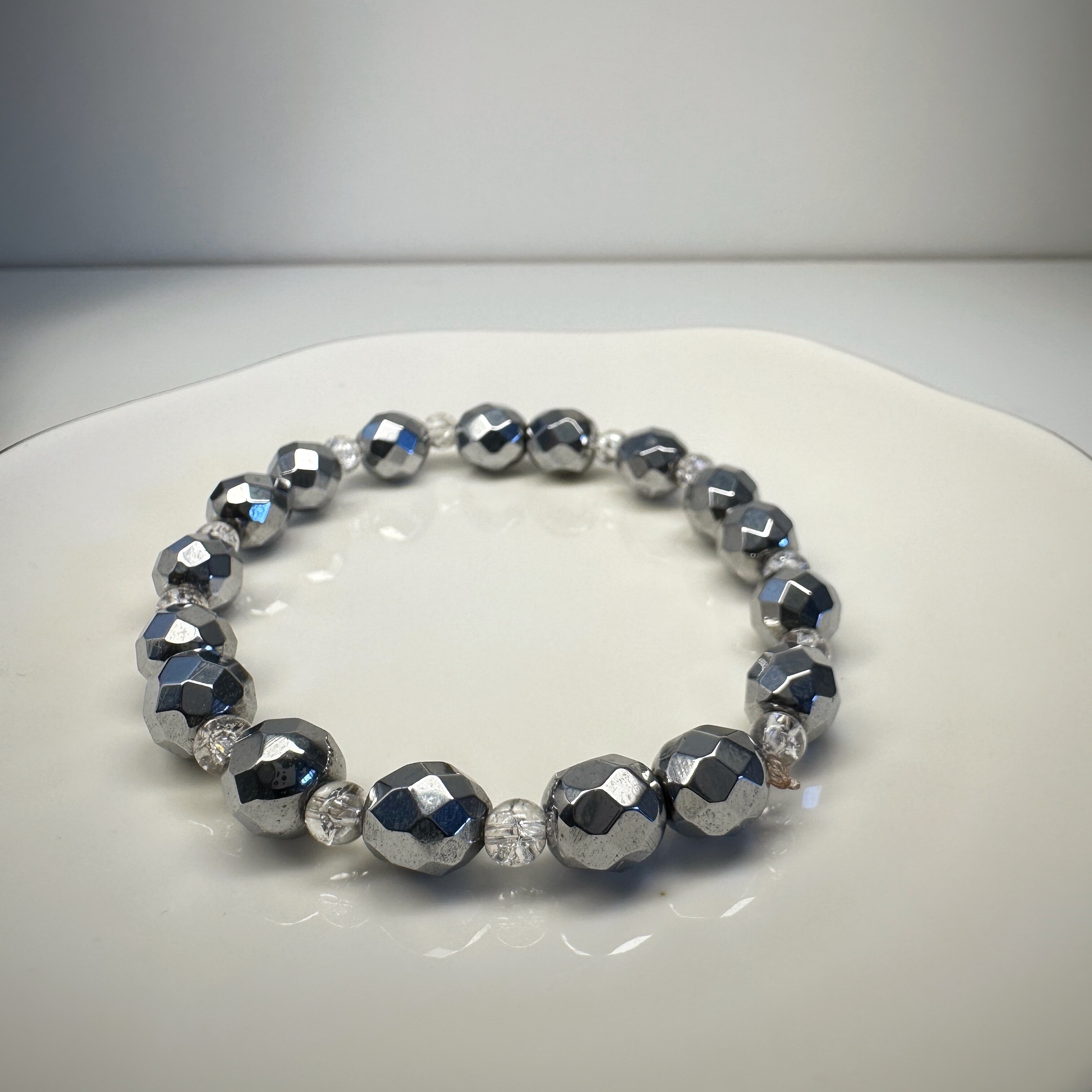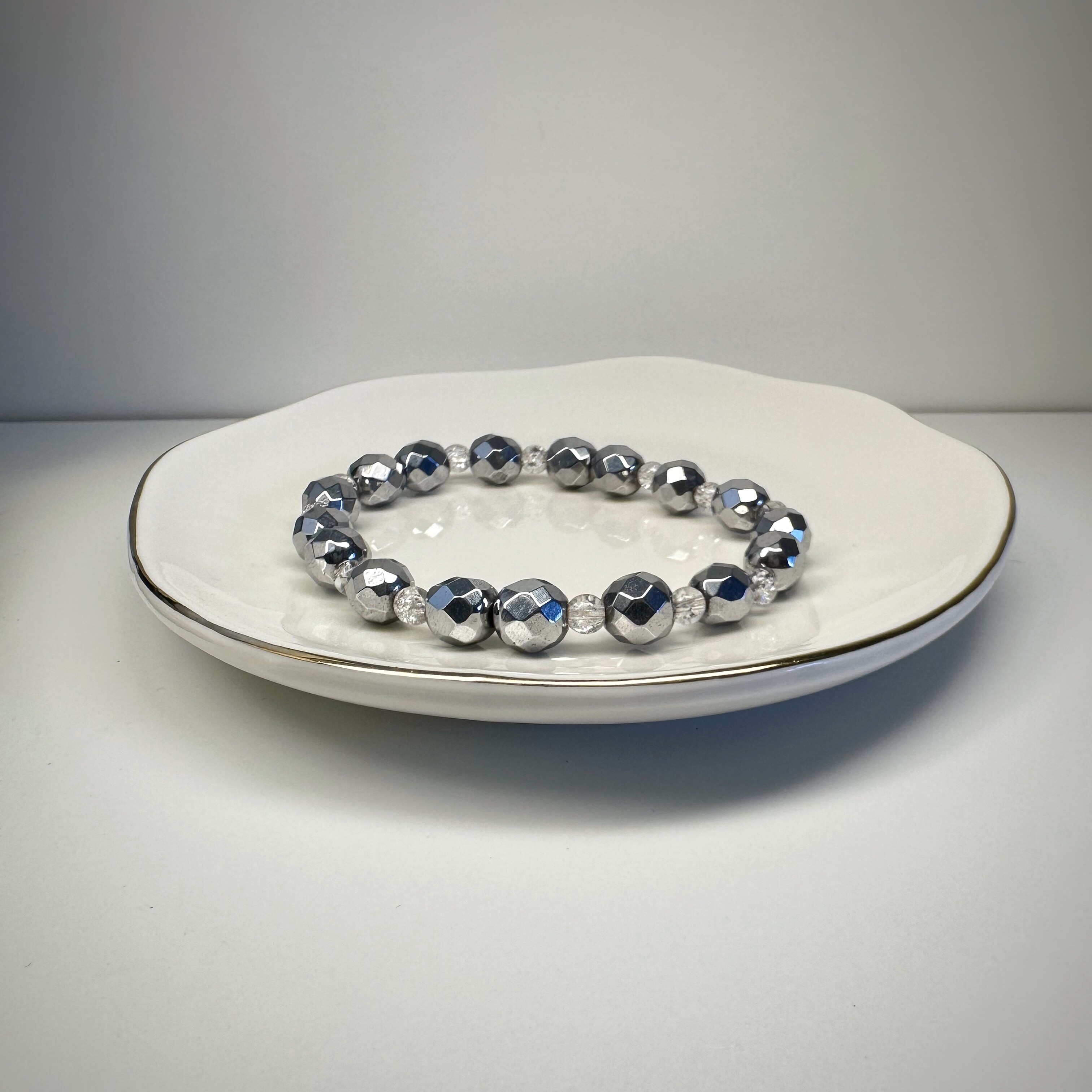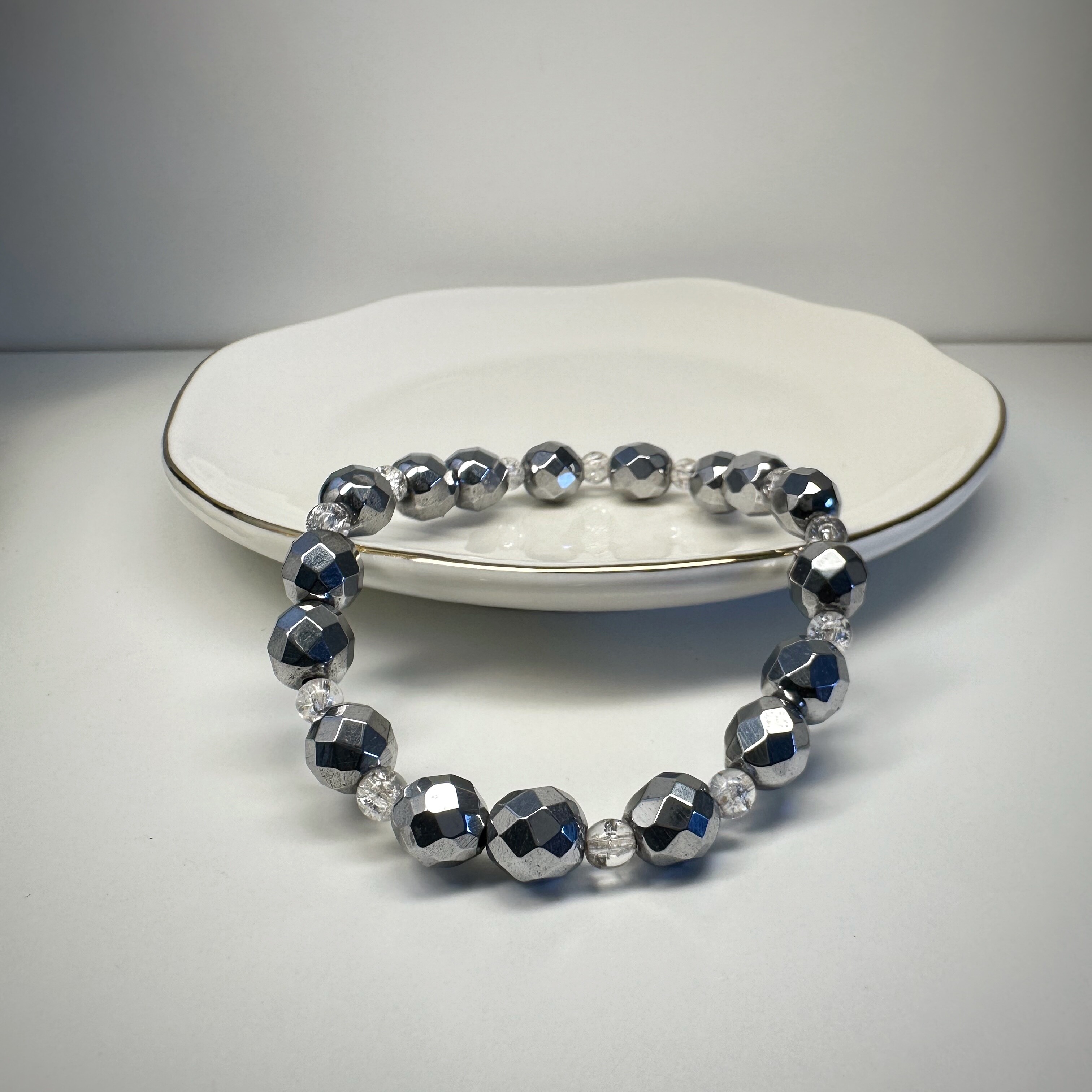 Srebrzystek to hematyt w swojej najbardziej efektownej formie – fasetowane, migoczące koraliki odbijają światło z każdej strony. Subtelnie luksusowa, ale wciąż codzienna.Kamień: hematyt srebrny, fasetowany