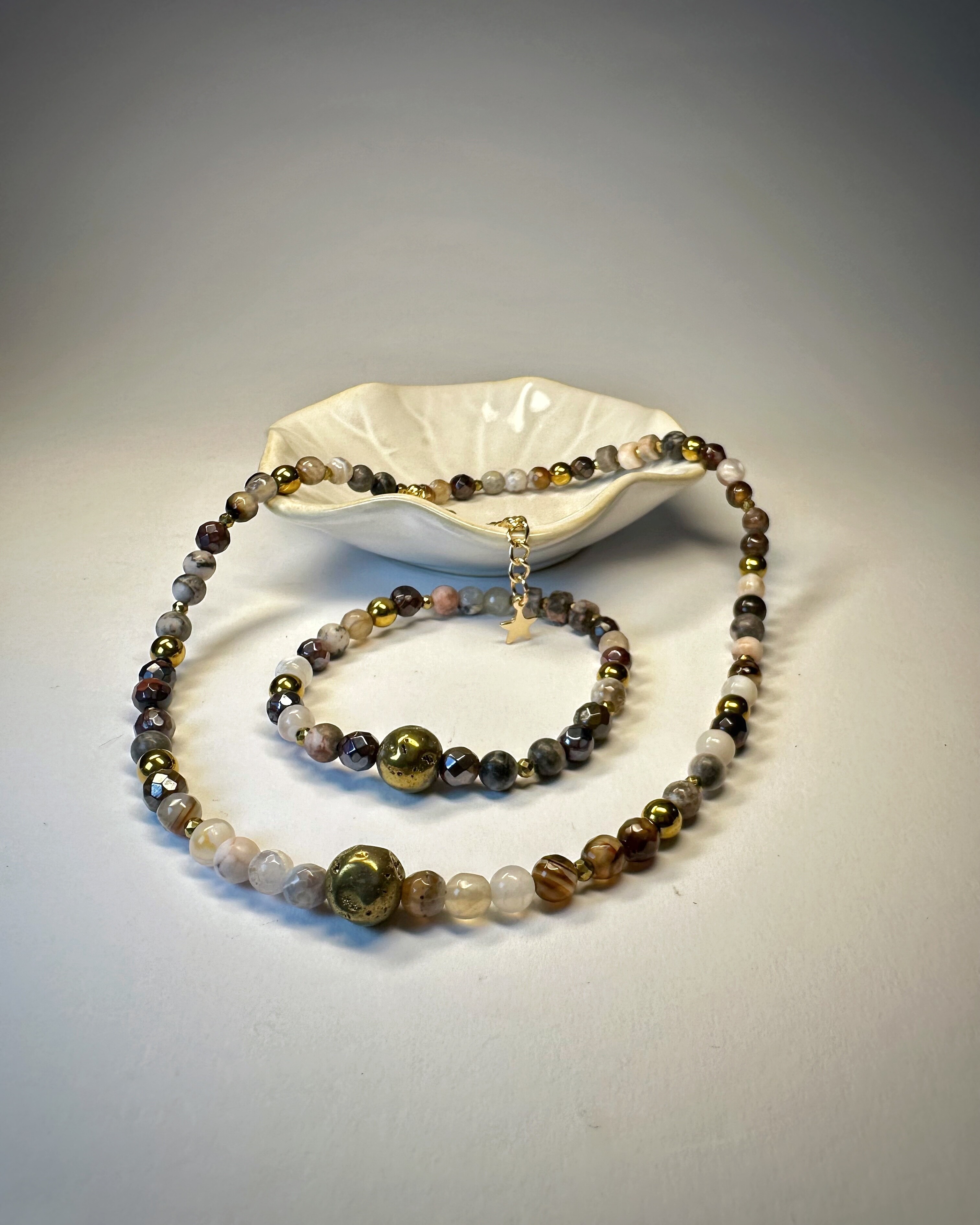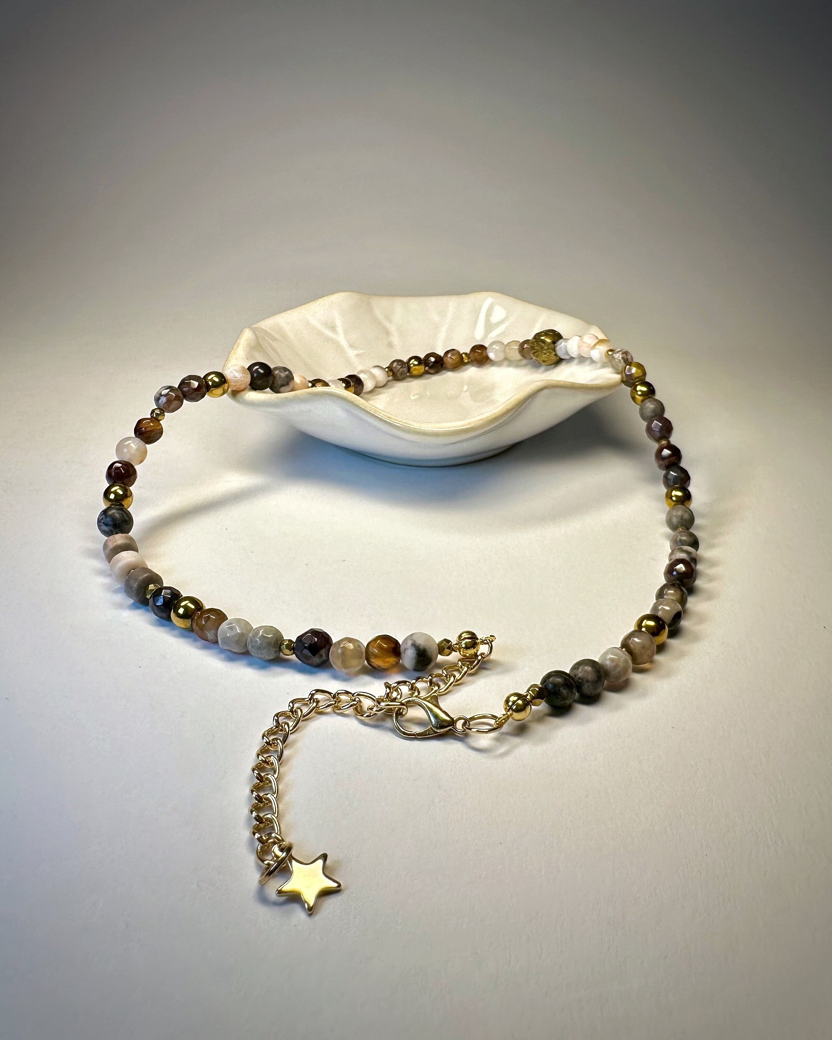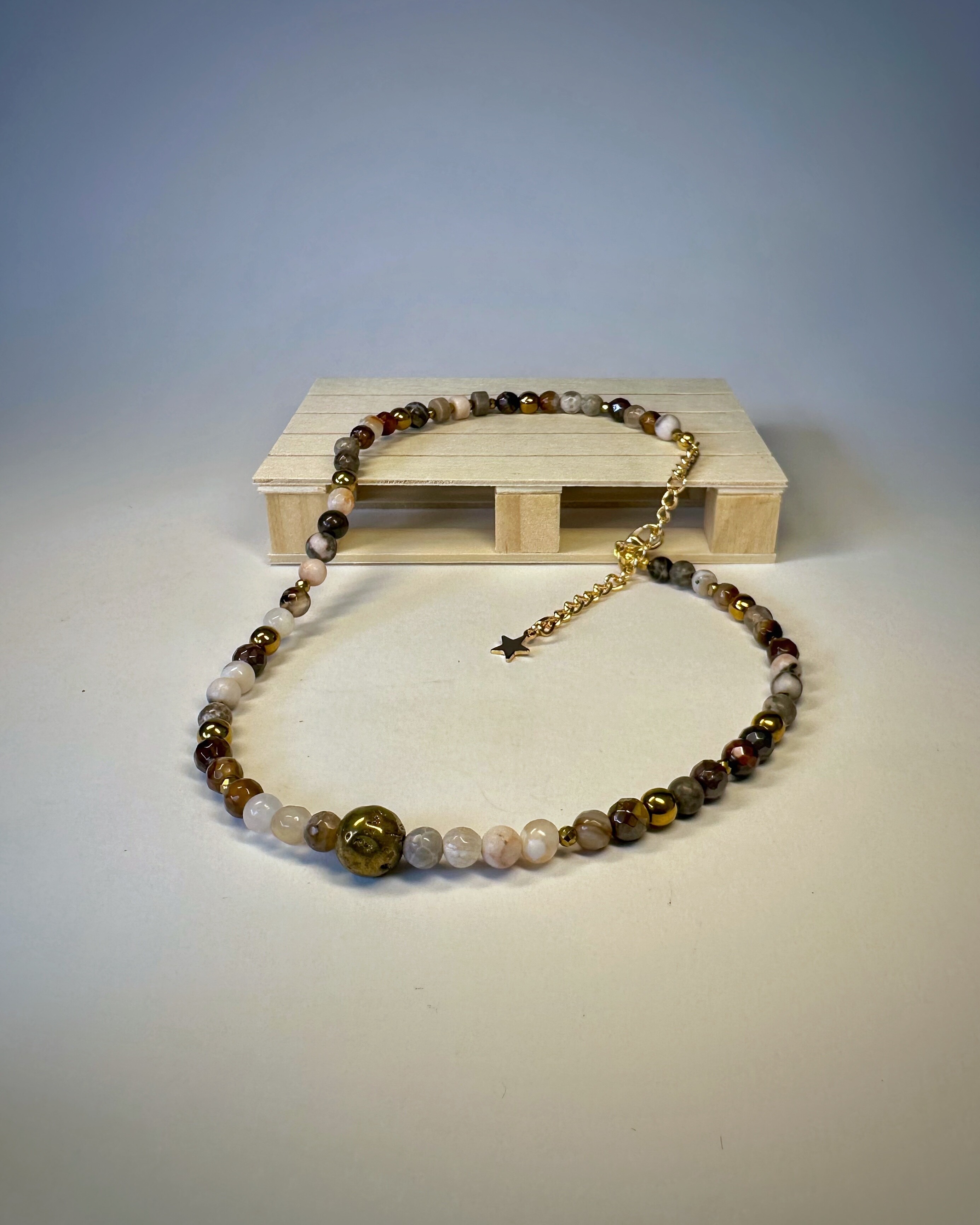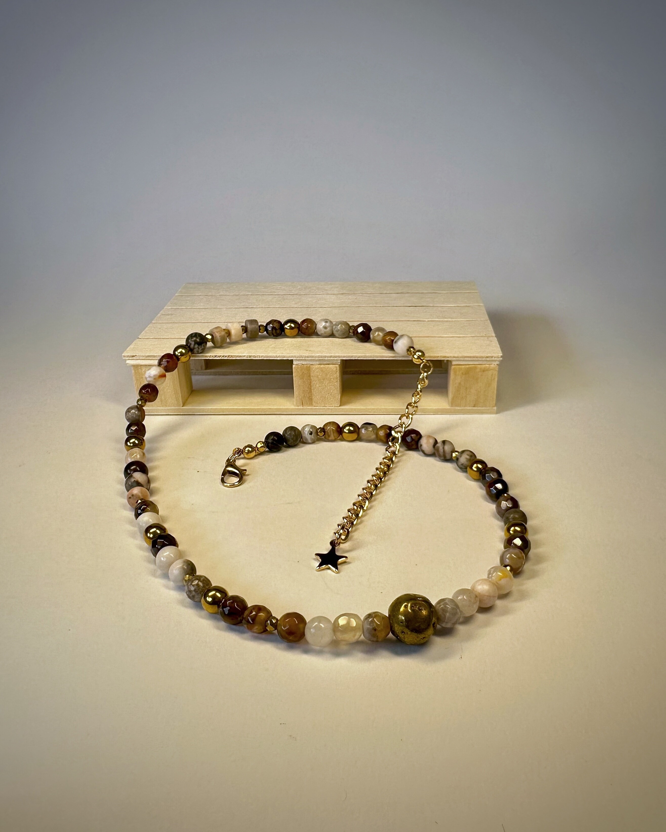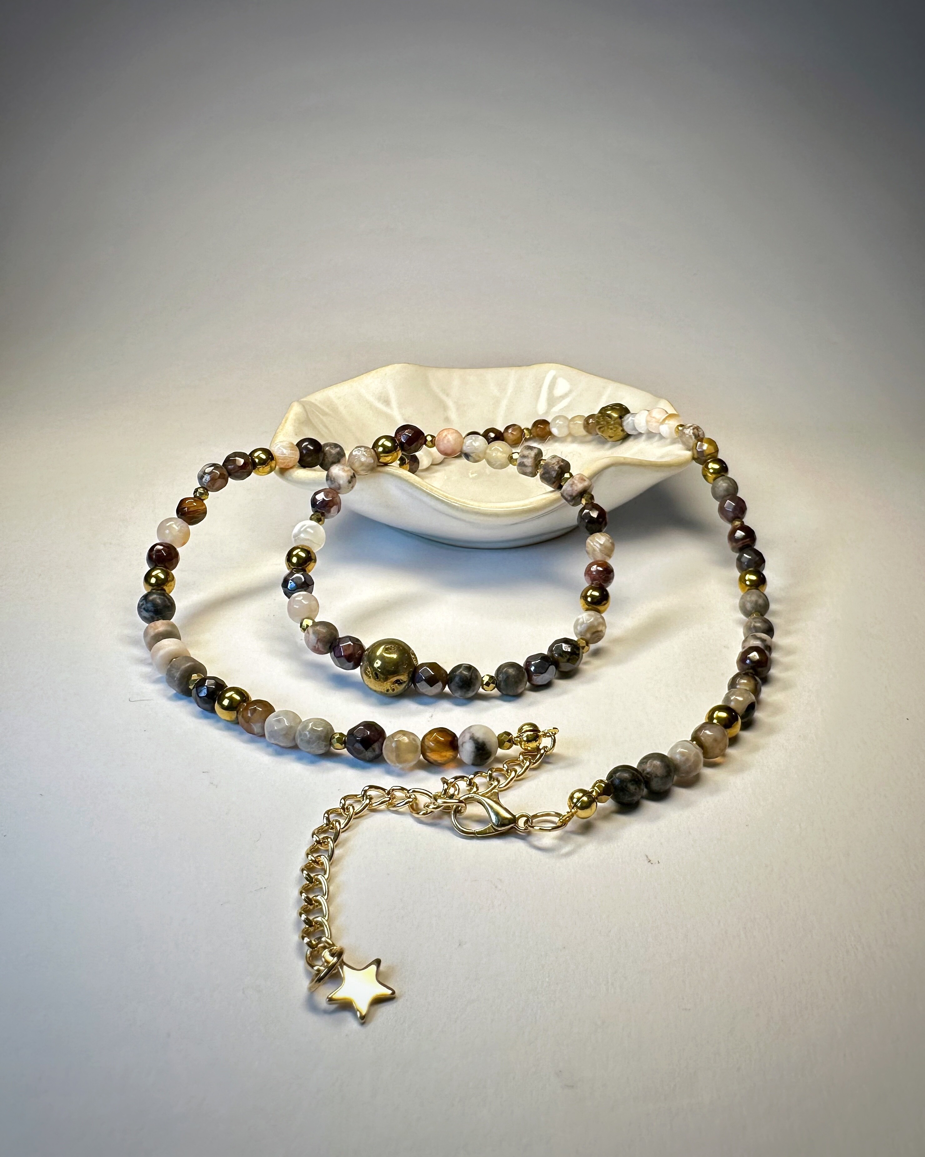 Chicago Loop, to ikoniczna kolej nadziemna, stalowe konstrukcje i ruch, który nigdy nie ustaje. THE L, to odzwierciedlenie tej energii ,gdzie odcienie brązu, szarości i bieli w kamieniach agatu spotykają się z ciepłym połyskiem tygrysiego oka i złotego hematytu. Ten naszyjnik daje możliwość noszenia na dwa sposoby, dzięki regulowanemu zapięciu z gwiazdką możesz podkreślić dekolt z przodu albo dodać pazura, pozwalając, by ozdoba opadała na plecy. To propozycja dla kobiet, które lubią, gdy biżuteria podąża za ich stylem i nastrojem.