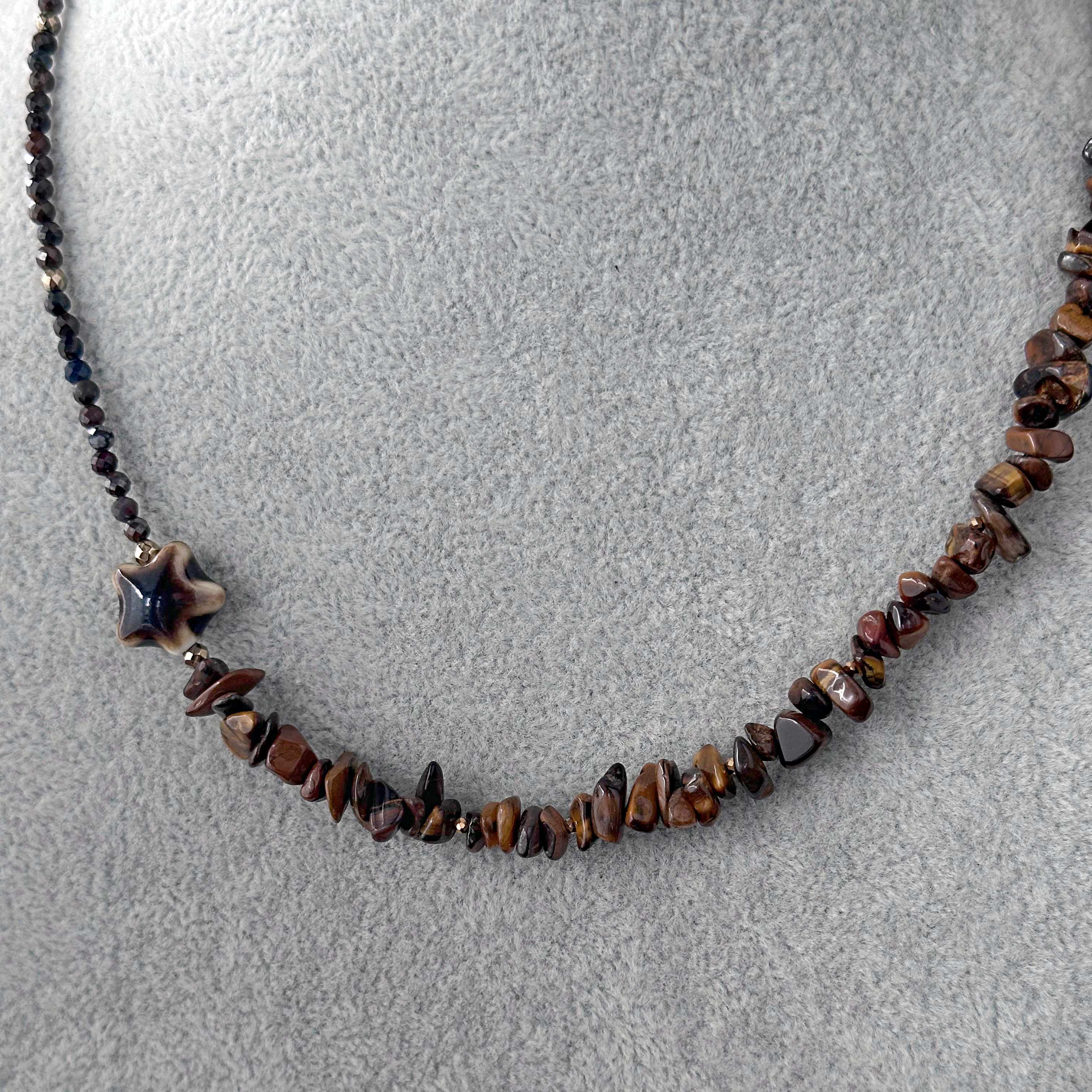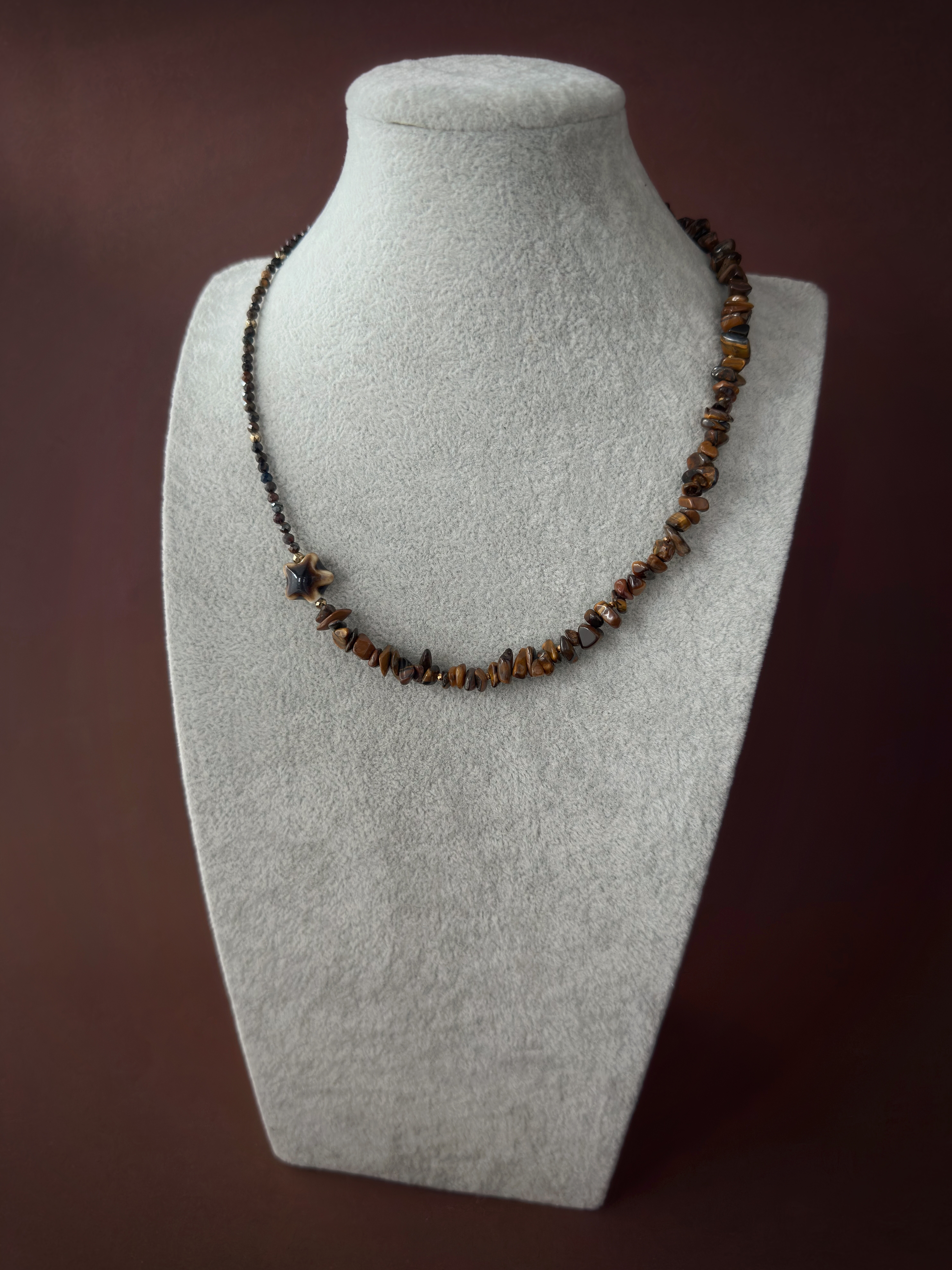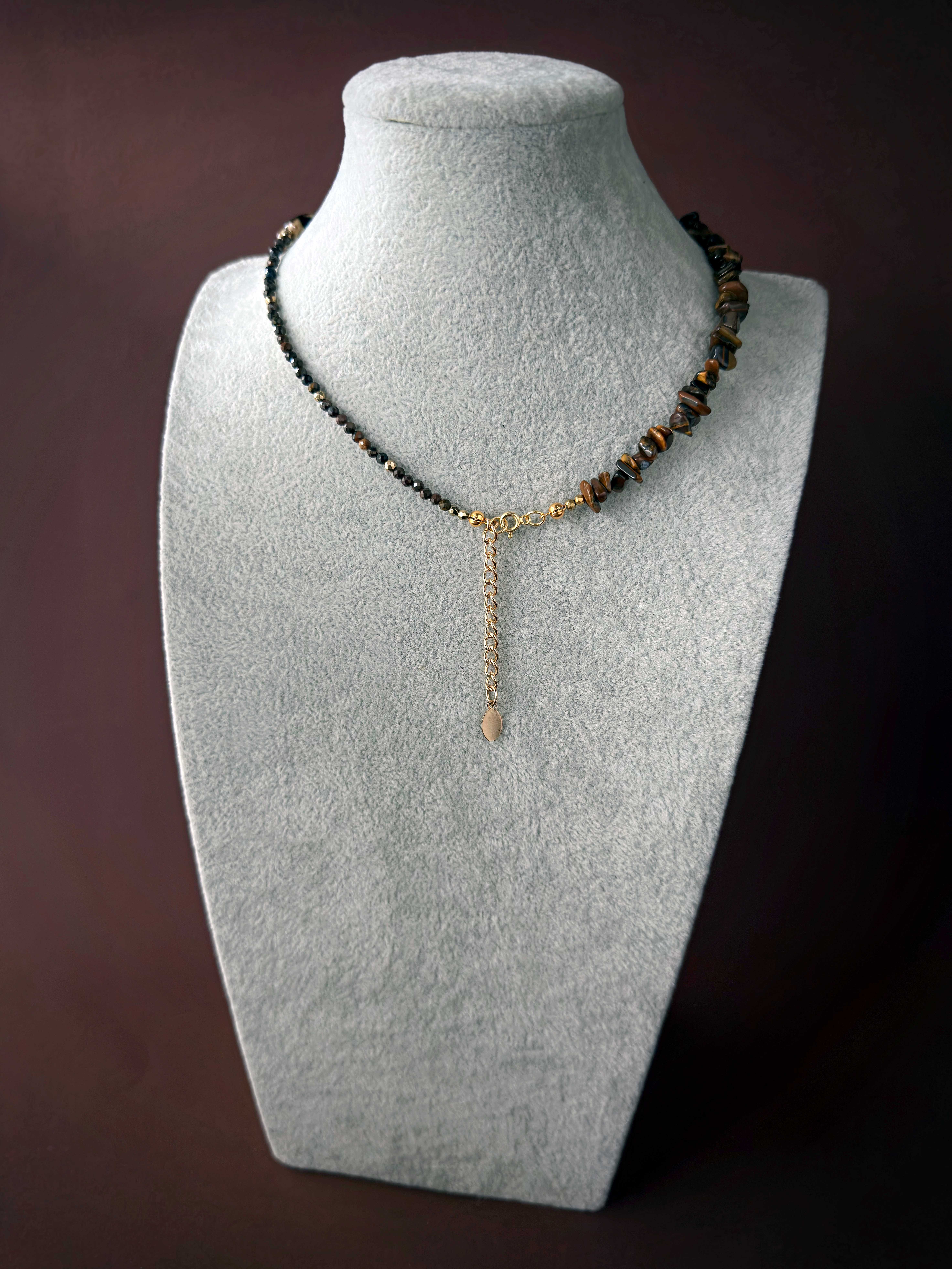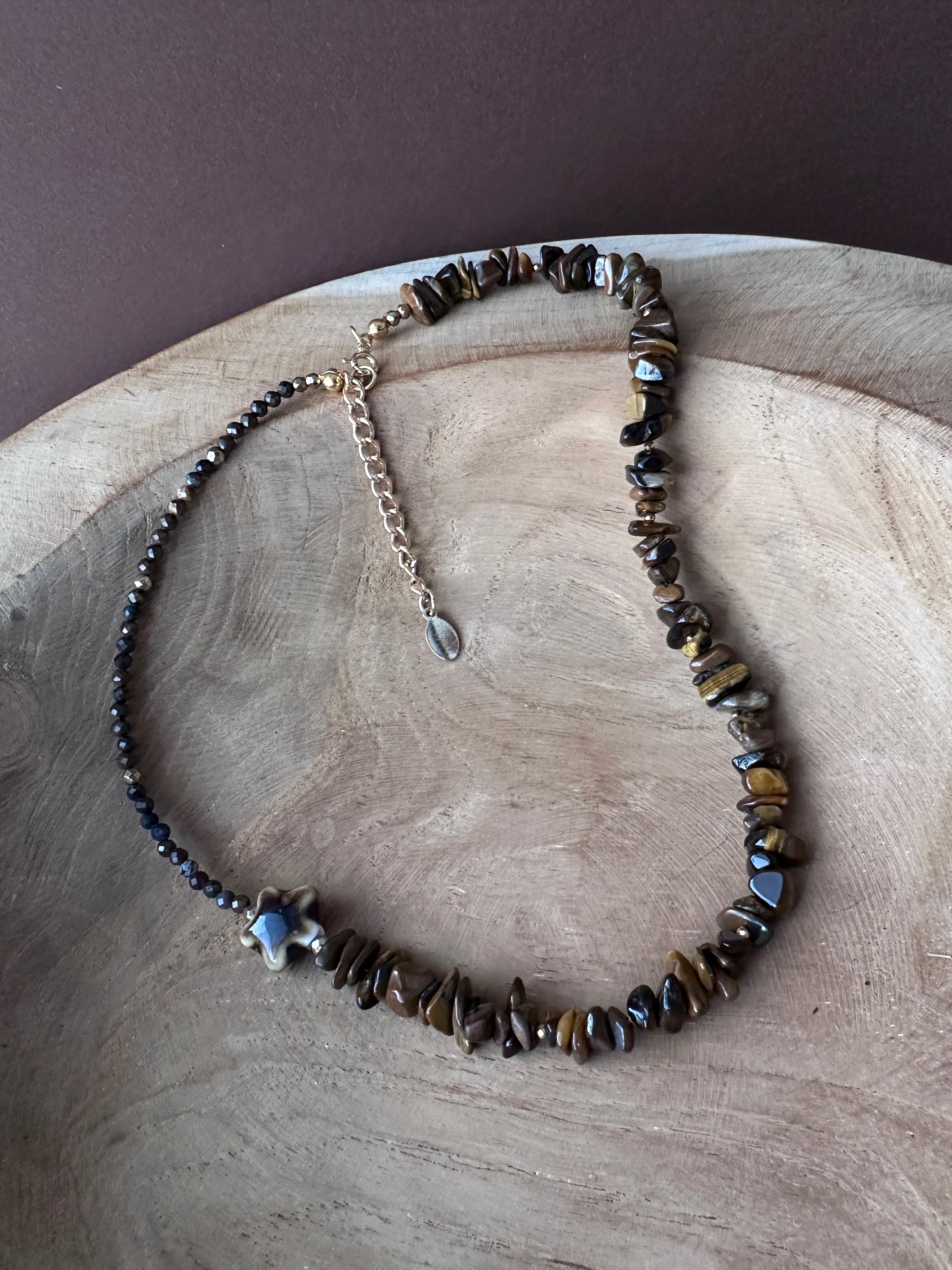 Ten naszyjnik powstał jako część serii Spotlight kolekcji stworzonej z myślą o kobietach, które chcą być widoczne, ale na własnych zasadach. Połączenie nieregularnych kamieni w kształcie kostki tygrysiego oka z drobnymi, fasetowanymi bryłkami i złotymi akcentami hematytu tworzy harmonijną całość, surową, a jednocześnie elegancką.