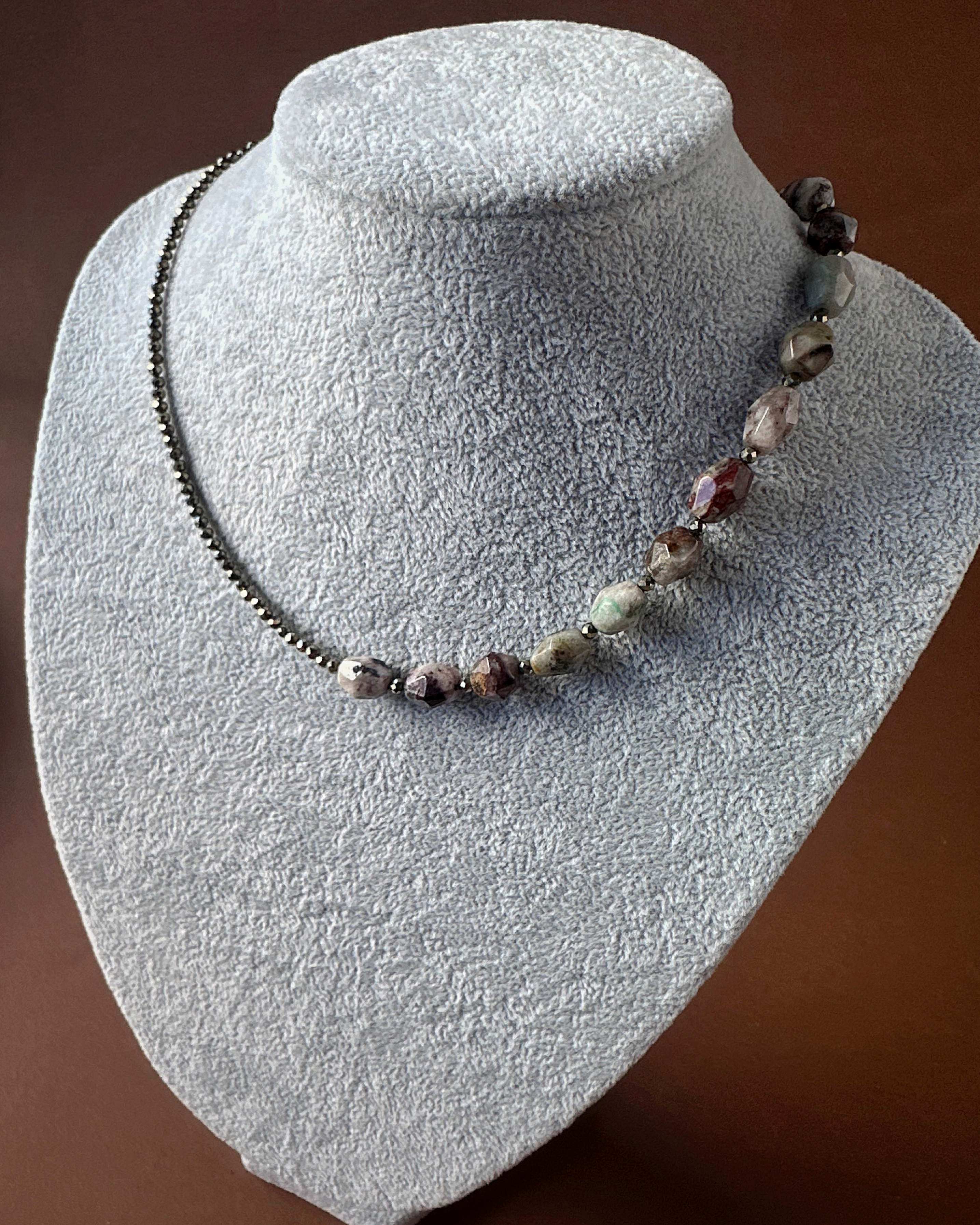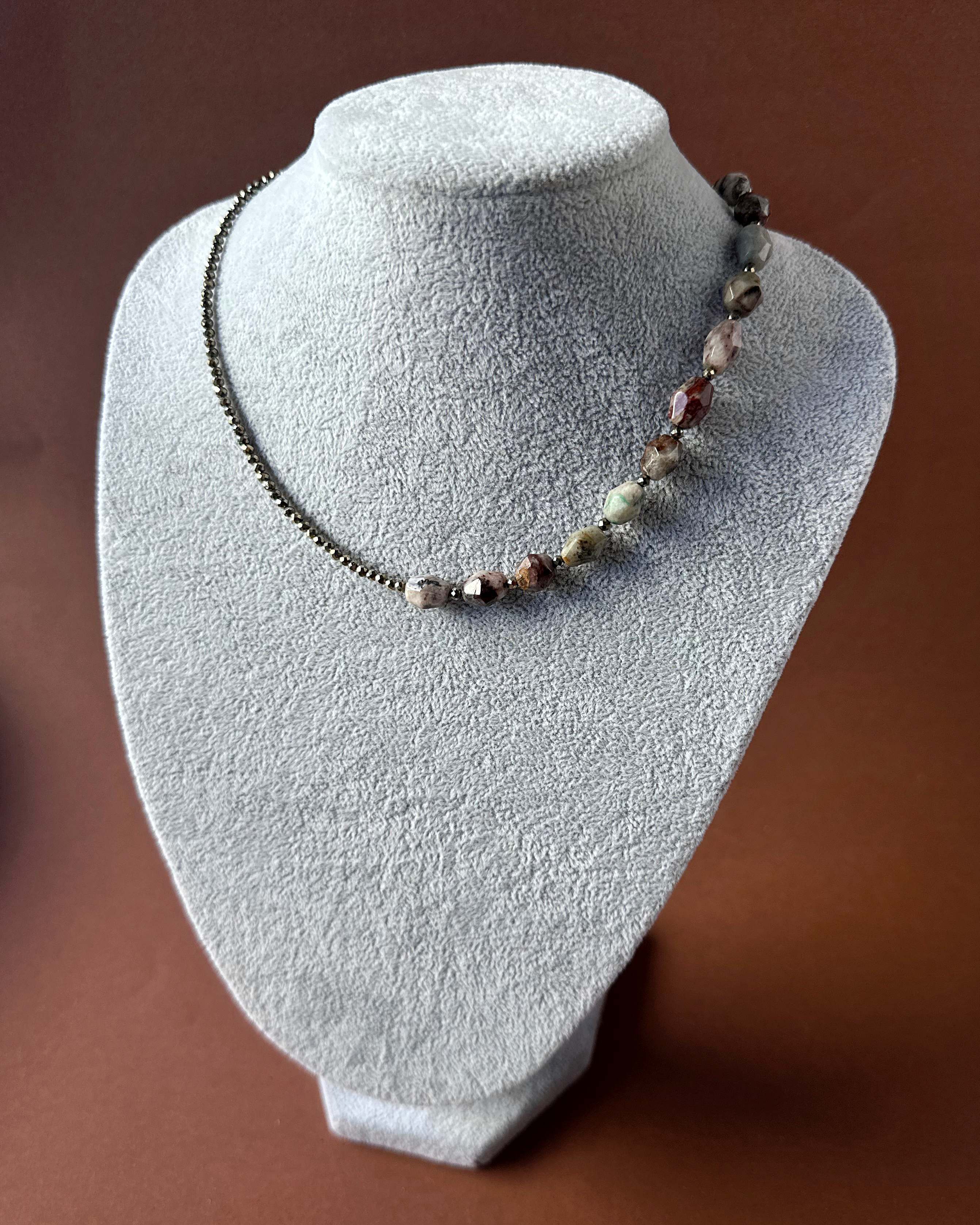 Nieregularne bryłki turkusu o średnicy około 8 mm tworzą wyjątkową, organiczną strukturę naszyjnika. Ich kolory, od błękitów, przez zielenie, po ciepłe brązy, układają się jak naturalny krajobraz. Druga część naszyjnika zbudowana jest z drobnych bryłek pirytu (3 mm), które wprowadzają złoty połysk i elegancki kontrast.