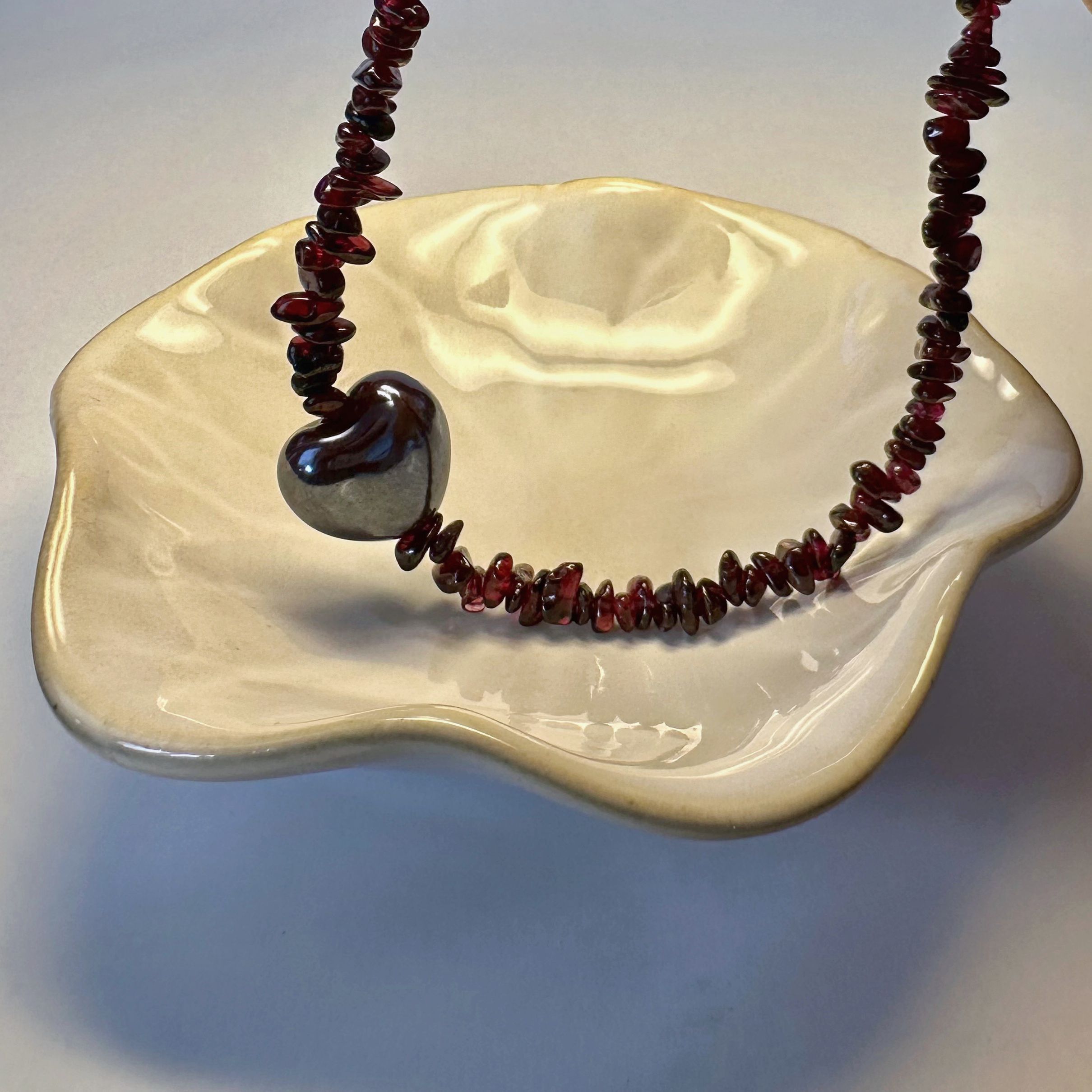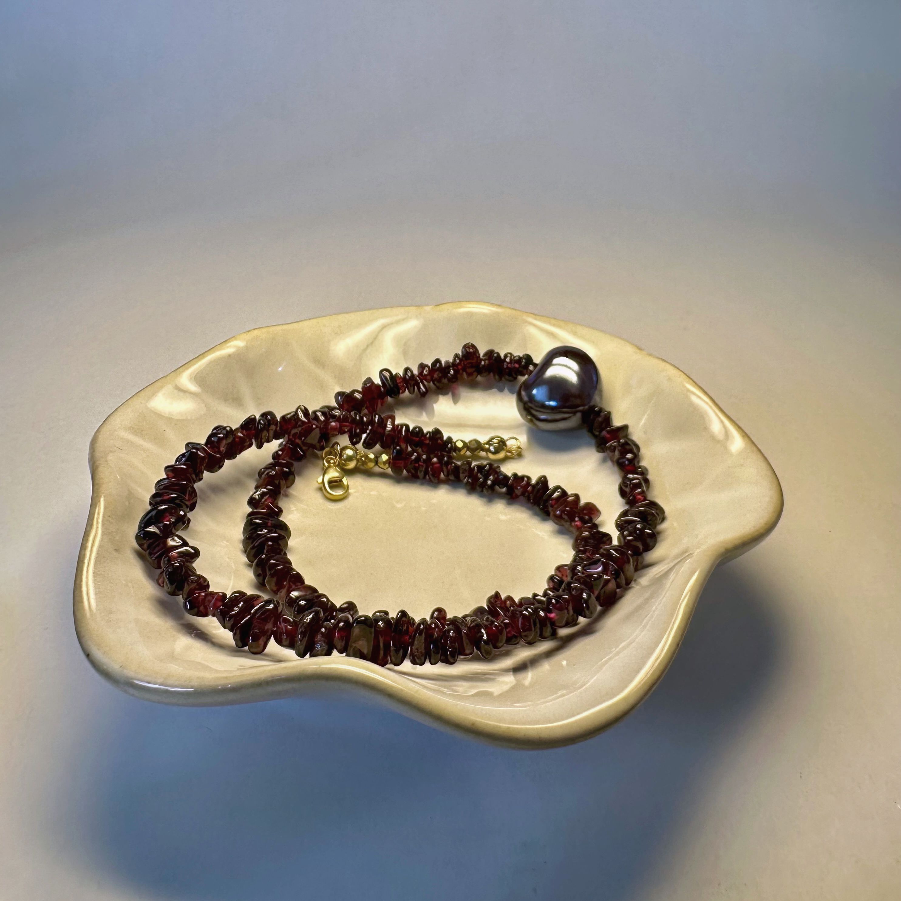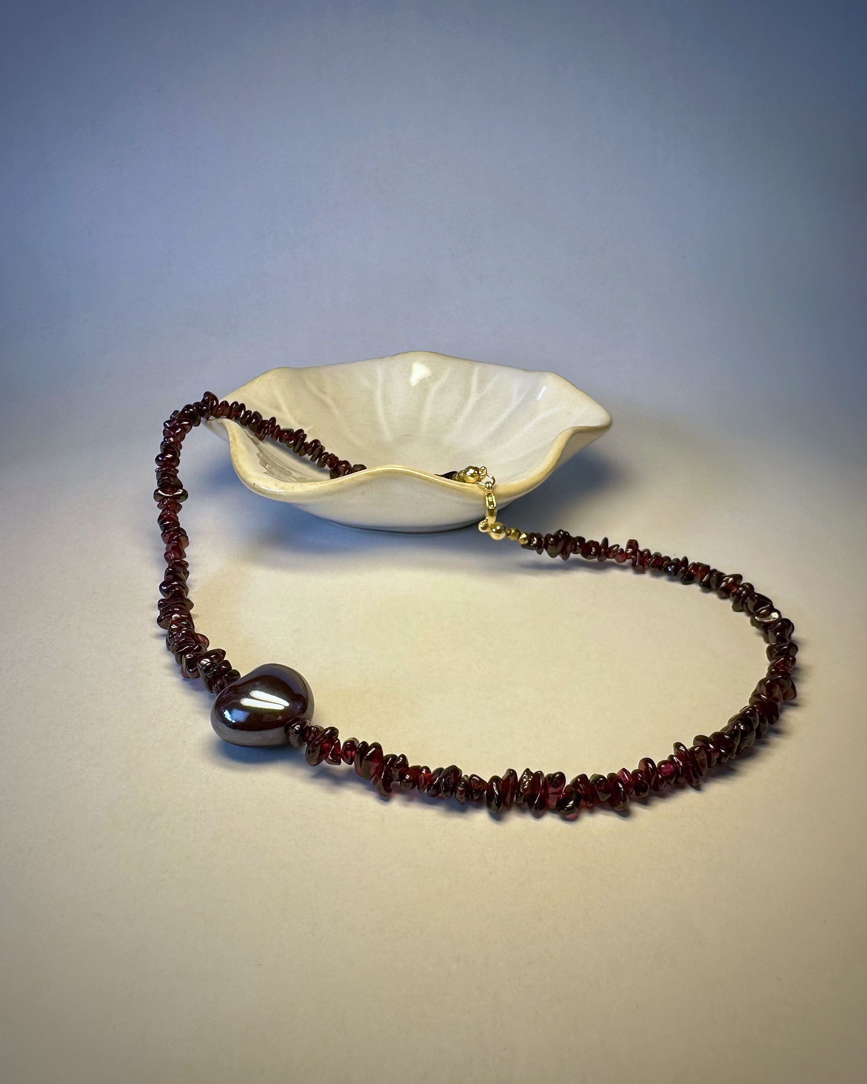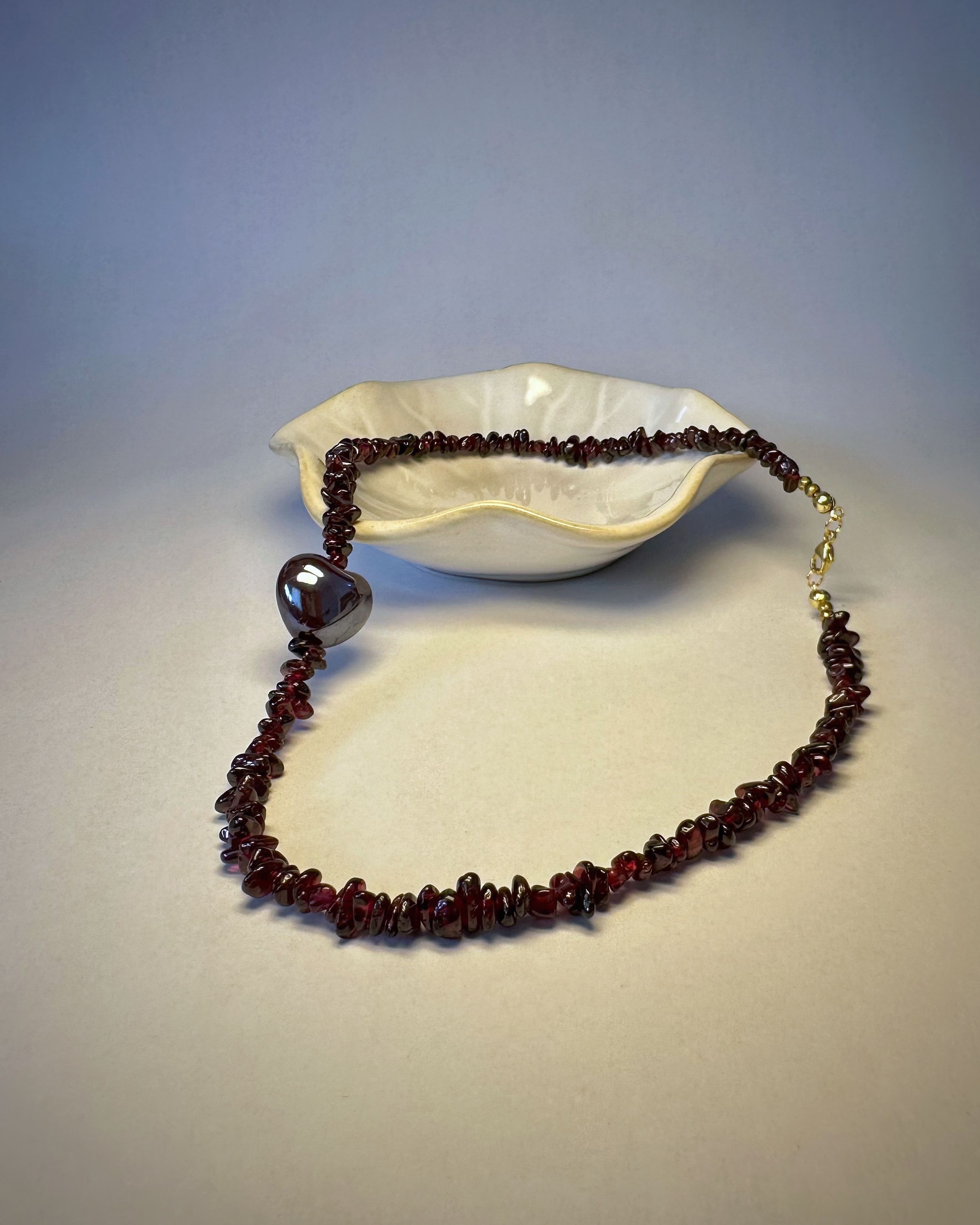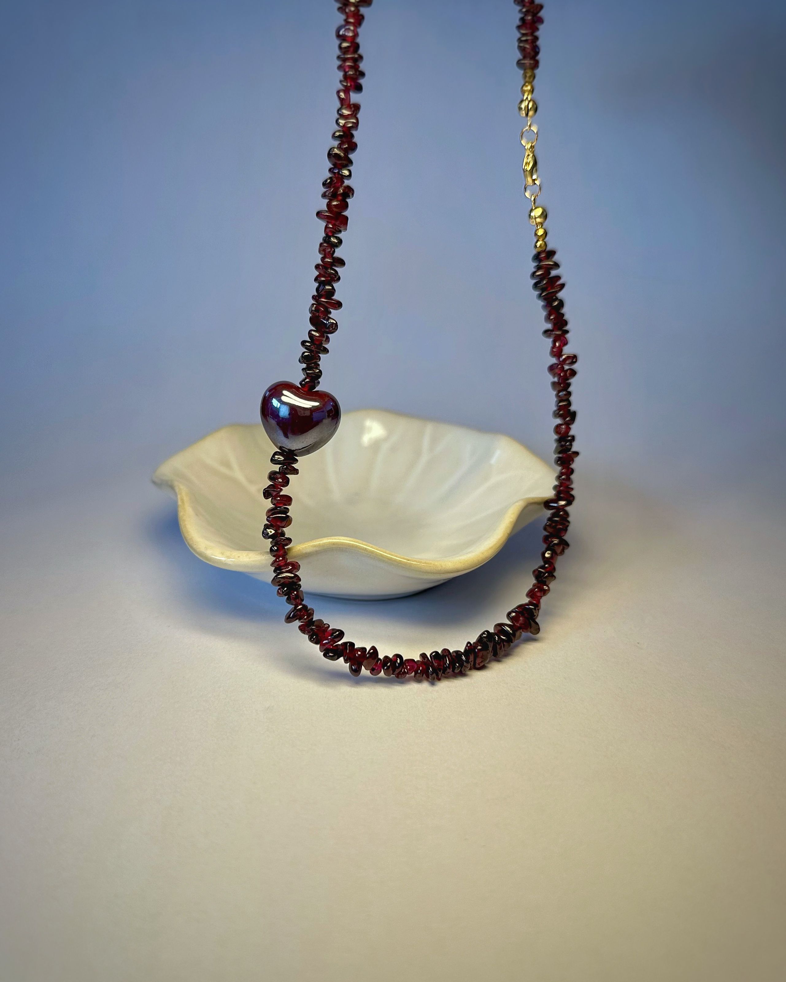 "Wine Essence" to naszyjnik, który łączy naturalne piękno granatu w nieregularnej formie z intensywnością bordowej ceramicznej zawieszki w kształcie serca. Kamienie mienią się jak krople czerwonego wina, wprowadzając aurę zmysłowości i tajemniczości. Granat to kamień pasji i odwagi, doskonale współgrający z energią znaków Barana, Lwa i Skorpiona. Pozłacane srebrne zapięcie podkreśla elegancki charakter biżuterii i zapewnia komfort noszenia.