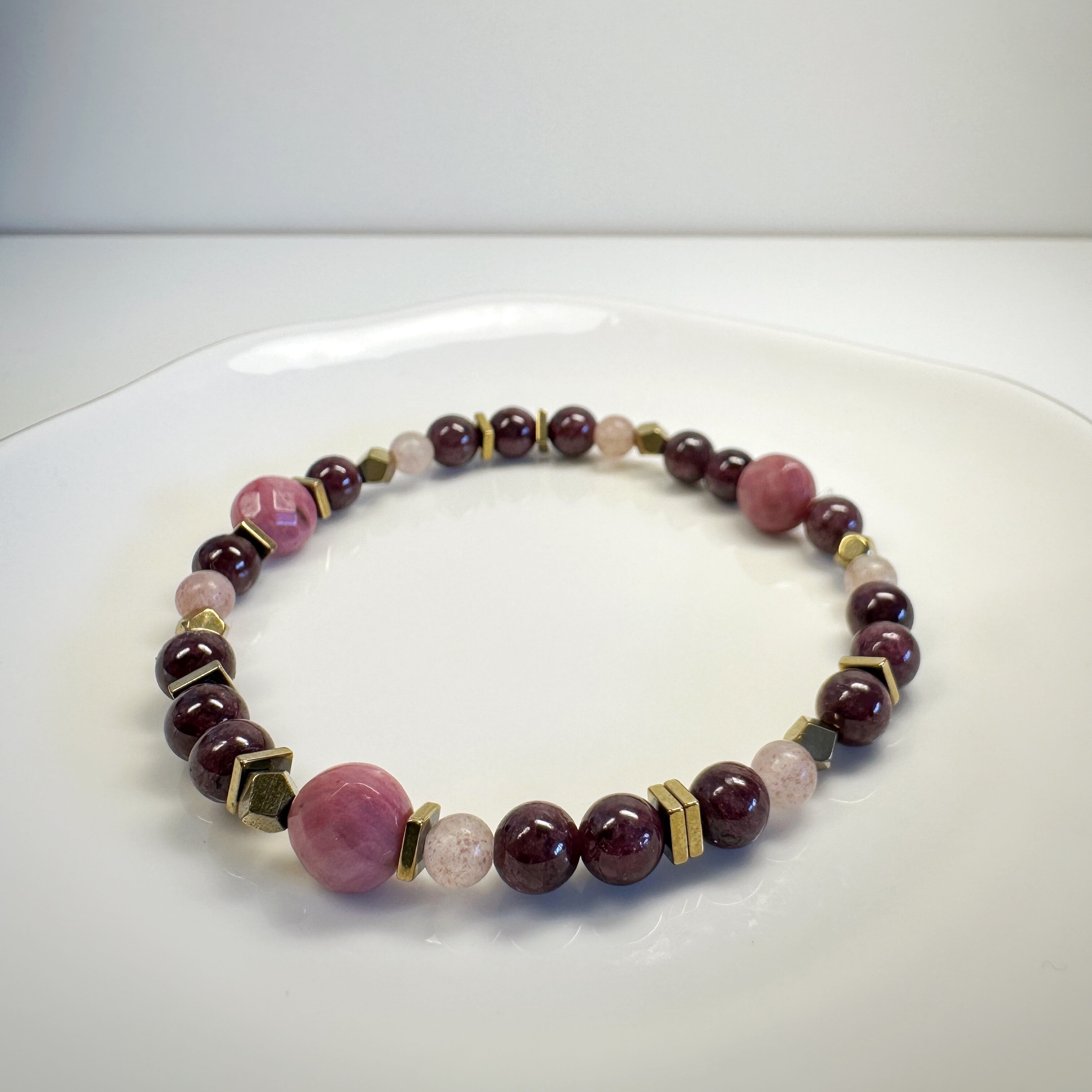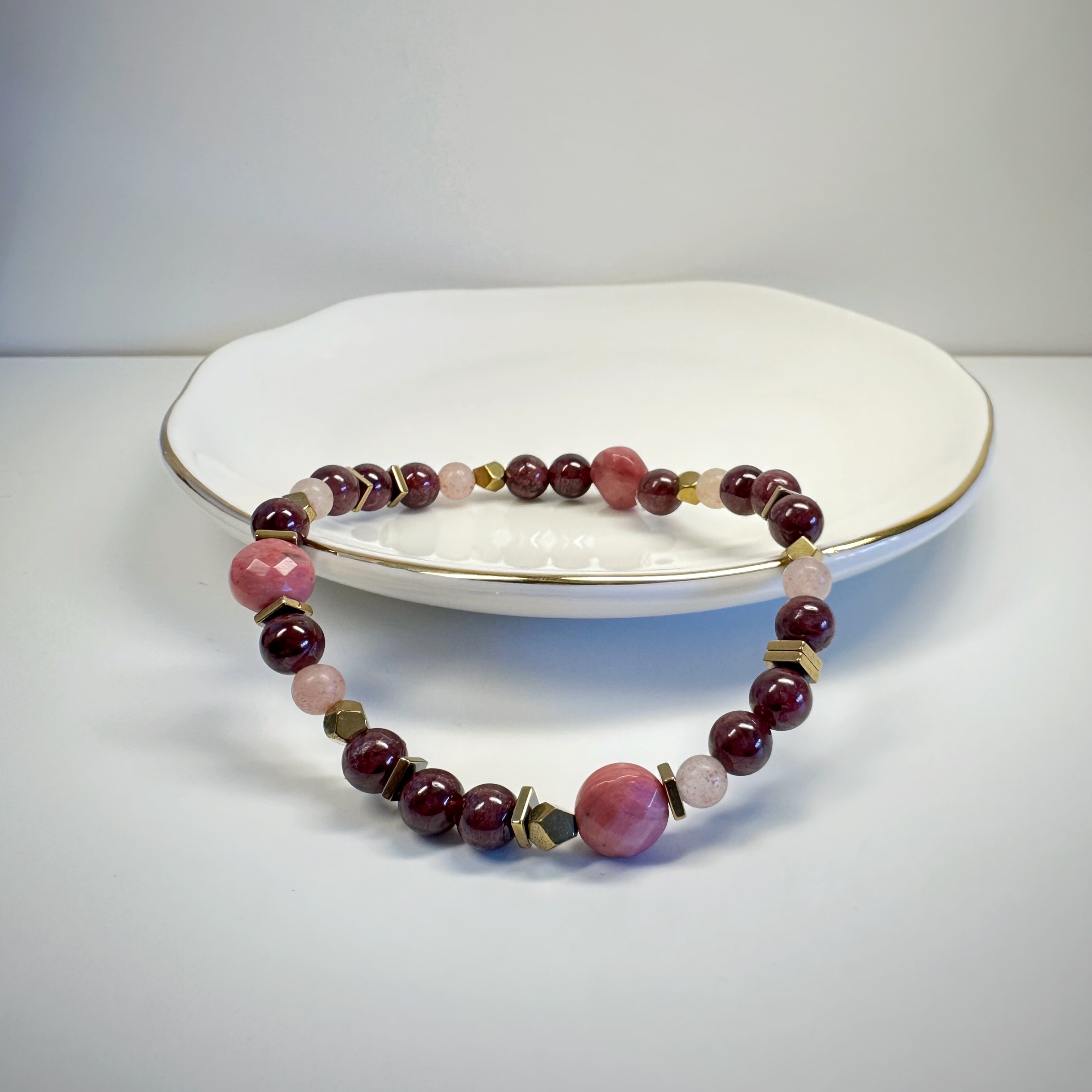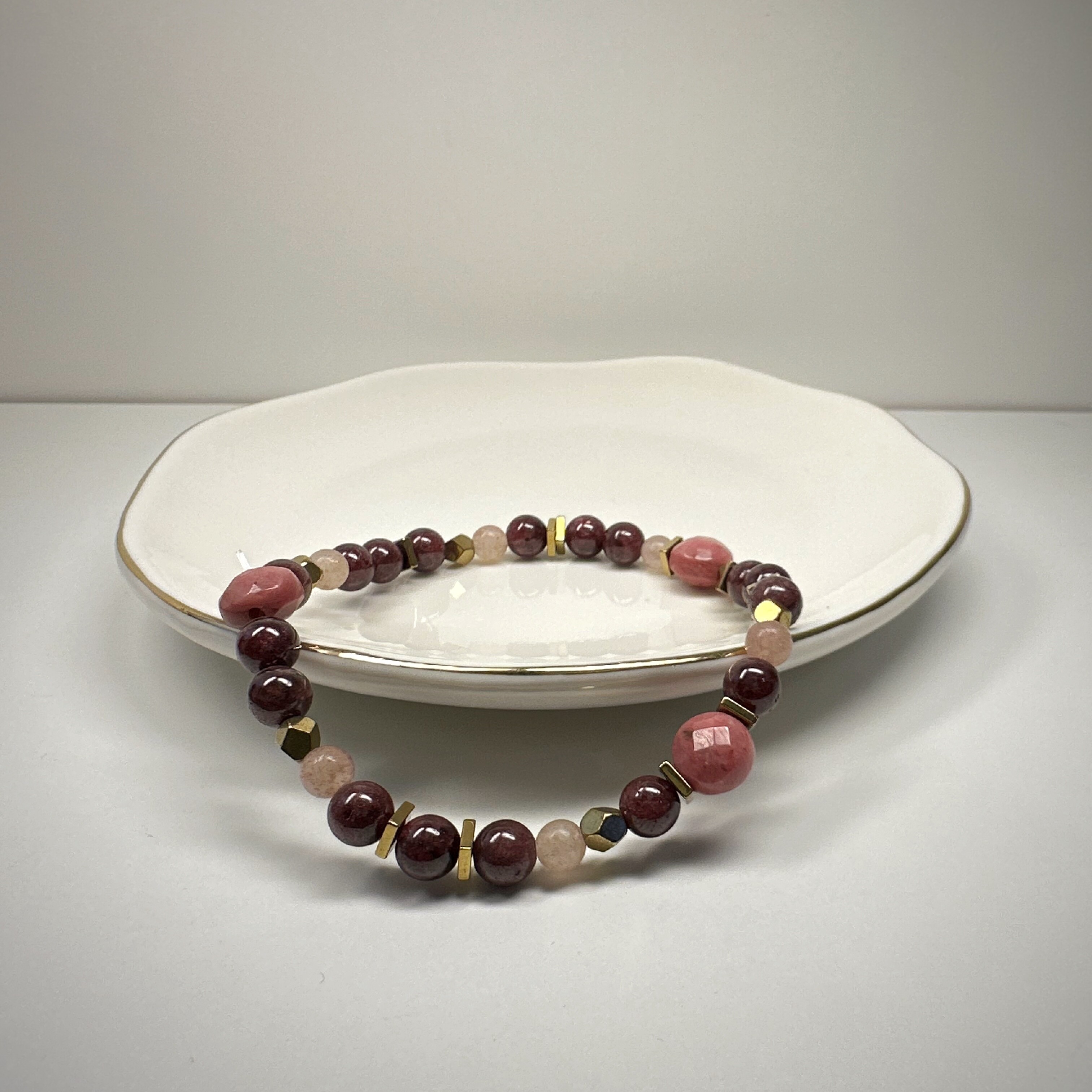 Wiśniówka otula ciepłem i barwą. Główny kamień to czerwony jaspis, wspierany przez bordowy i różowy hematyt. Wygląda jak malinowo-wiśniowa konfitura – słodka, głęboka, kobieca.Kolor: bordo, ceglasty róż, wiśniaKolekcja: